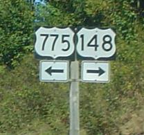 Courtesy Lou Corsaro, this is at the end of the Exit 8 offramp, and clearly wrong, since the highest US highway number is 730 and the only one ever higher was 830. Also, none of the incarnations of US 48 ever had a spur. VA 148 is a primary highway to the right (gumdrop shield), and VA 775 is a secondary highway to the left (circle shield).