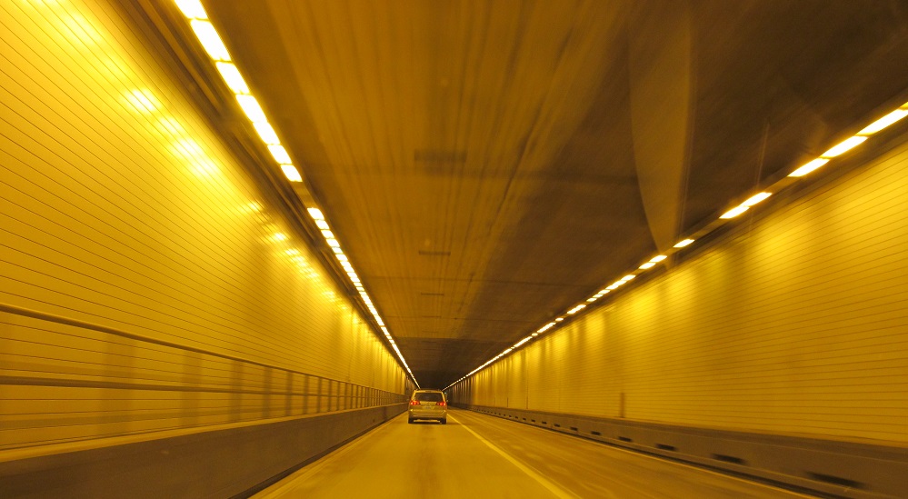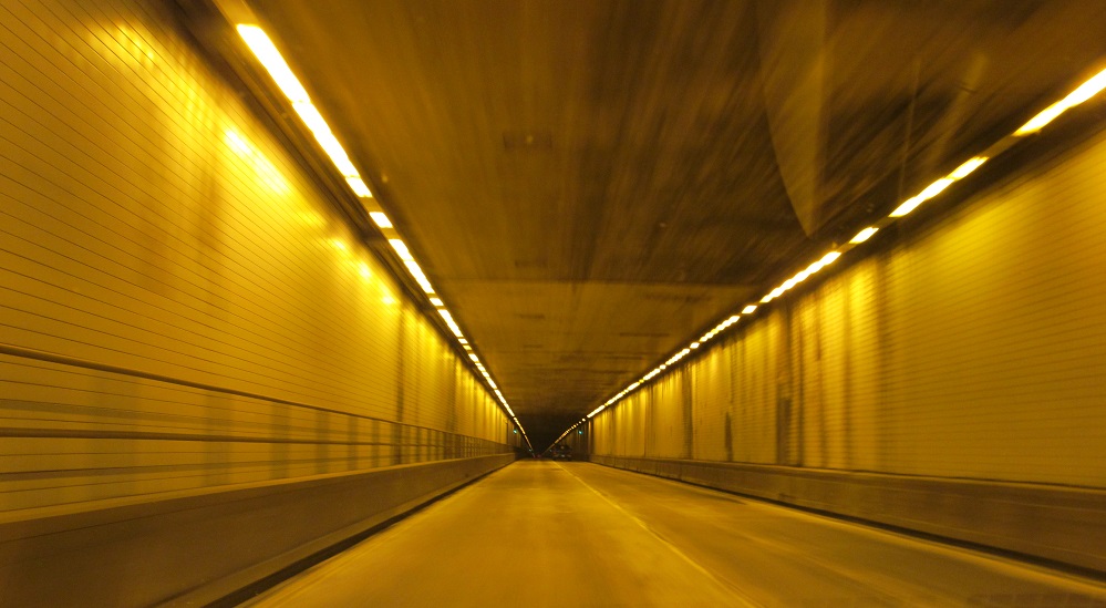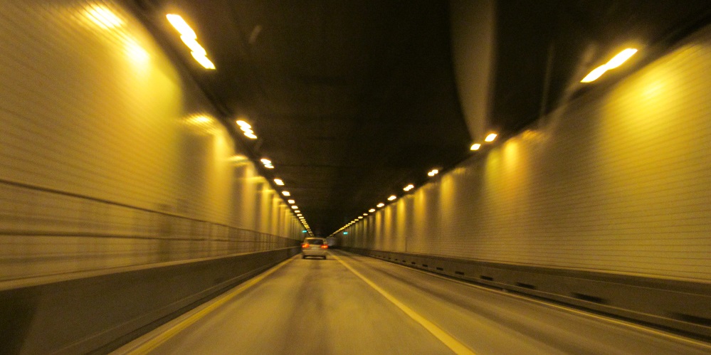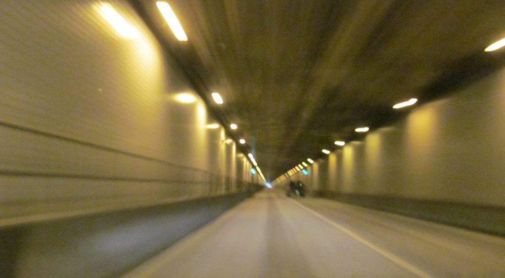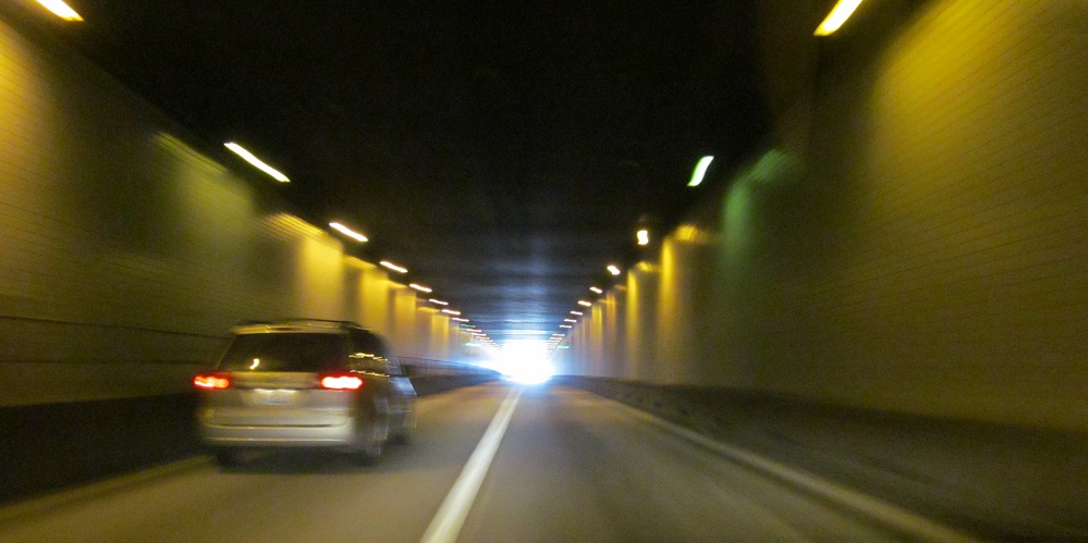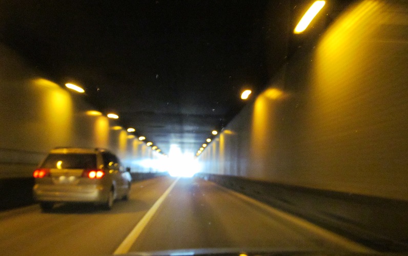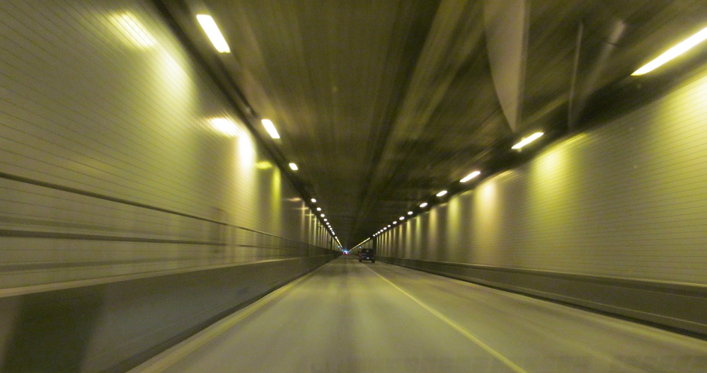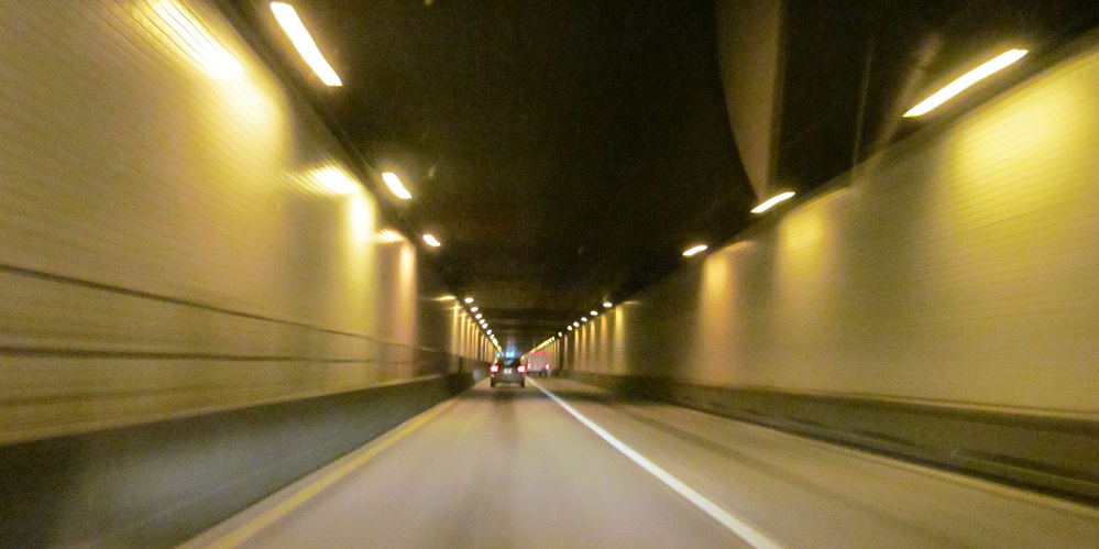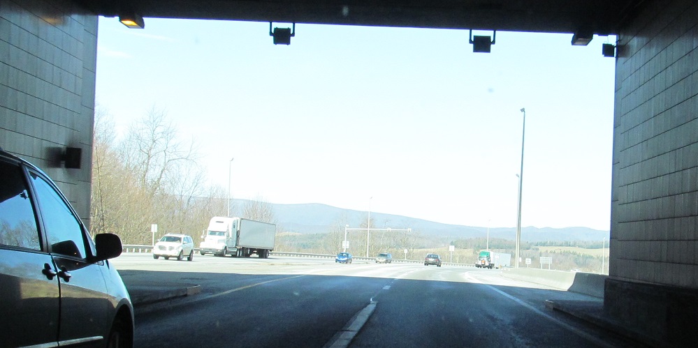 The first of a pair of tunnels approaching the state line. Click on the 3rd photo to see the tunnel lettering up close. They look vintage, but the tunnel only opened in 1972.