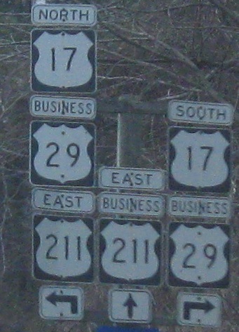 US 211 leaves Business US 29 and Business US 17 in Warrenton. I'm willing to count all of the state route shields as a group error, but then add the narrow banners and lack of "Business" banner over US 17. Subtract the cool small shields at the divergence point, and we're a new contractor away from calling it even.