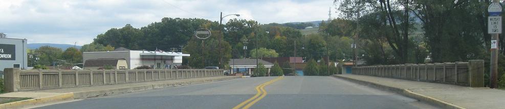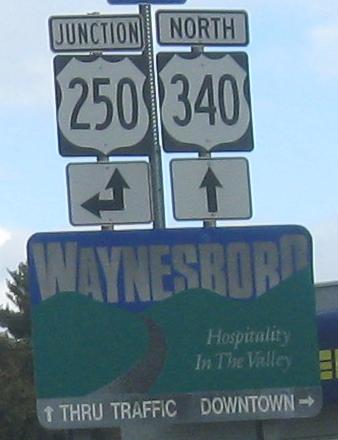 All is well and good until I get to Waynesboro, which is also where you see the photo atop this page. That town, or at least the contractor for the intersections therein, has a distinct aversion to using proper-width shields. What's worse, though, is the aversion to signing US 340 properly. While straight ahead is intended as a bypass of downtown (by all of two blocks), officially US 340 turns right on the old Main Street while only US 250 continues straight. The two routes, which originally ran together down Main Street, do meet up for a brief stint together, but not until crossing the South River bridge to the east side of town.
