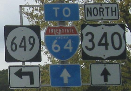 US 340, formerly also US 250, NB down Main St. and across said bridge. US 250 was rerouted to Broad St. when a newer bridge was built just downstream in the 1950s (so that should have left plenty of time to erase the confusion), and then they meet on the east side for a short concurrency before parting ways for good. The I-64 trailblazers are misleading - turn right to get to I-64 WB, but go straight on US 250 to continue east.