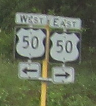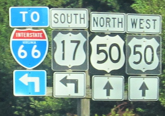 WB through Middleburg to the US 17 junction, with an error slapping me in the face. South US 17 is left, North and West US 50 are straight. Someone had the wrong replacement shield aboard for that one. You could say they had 50/50 vision?
