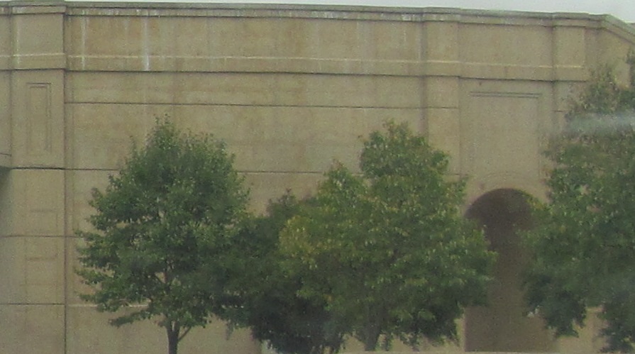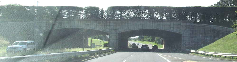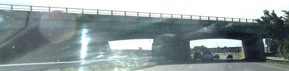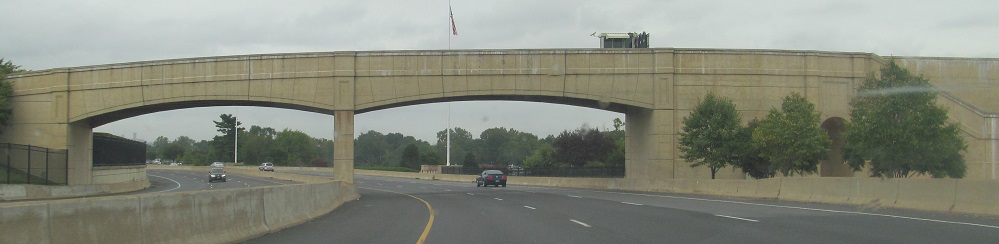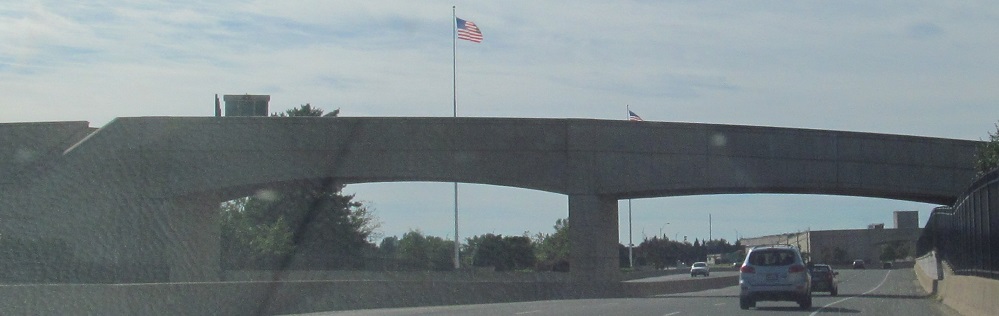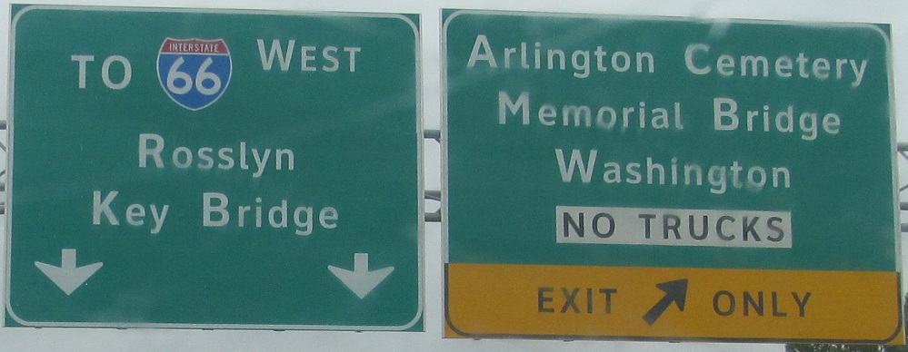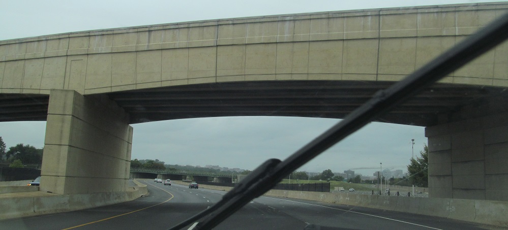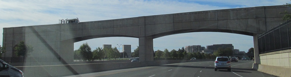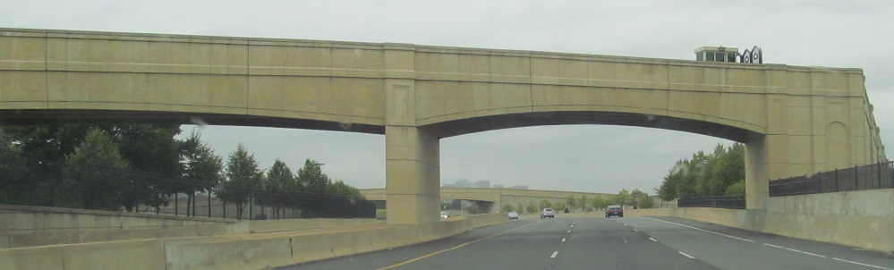 Northbound, in order: Pentagon connector road, a pair of pedestrian overpasses (one with closeup) connecting exterior parking lots to the Pentagon, north parking lot road, Washington Blvd., and Memorial Ave. The latter is the westward extension of Arlington Memorial Bridge, which I include here for the mistake of specifying a 3/4 height upper case letter for lower case text.