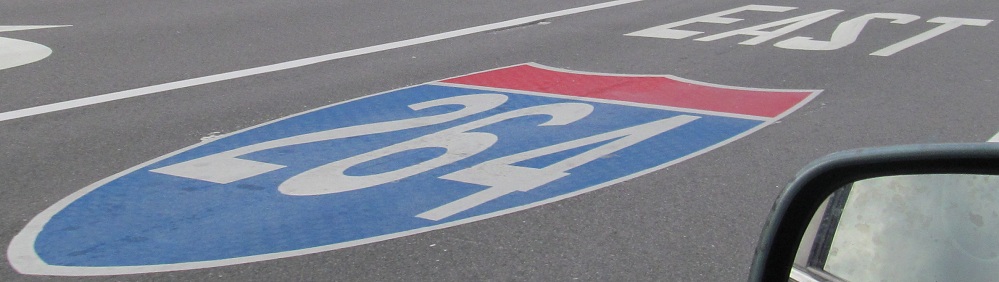 As much as I like pavement shields, I have to flag this one for a blatant font violation. The left lane goes to Greenwich Rd., and then the I-264 entrance follows shortly after. I see four fouls on the far side of I-264: bubble shield on top, directional banner below, all on a green sign, and Clearview in the background.