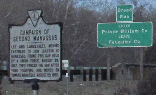 Heading east by fading twilight, here are some signs to the county line (marked by adjacent I-66) with more of Second Manassas/Bull Run.