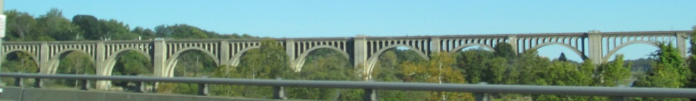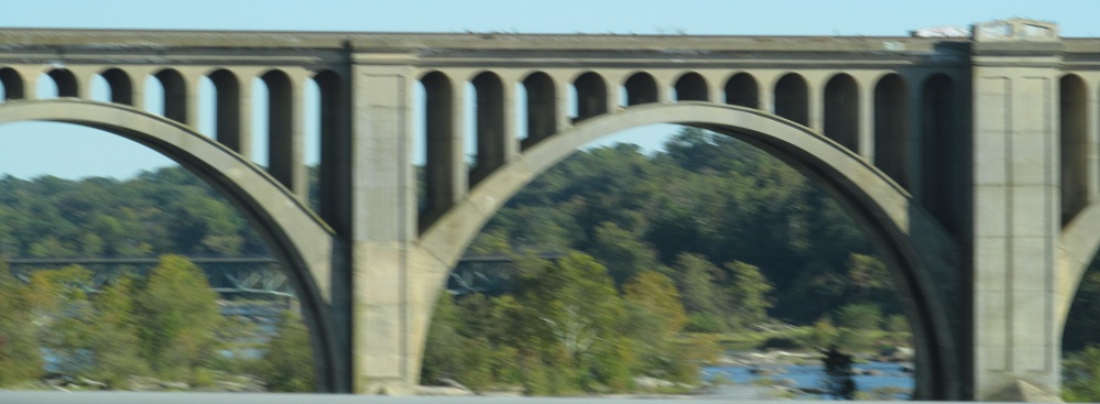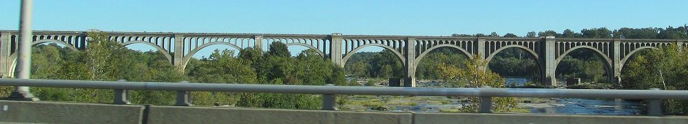 Looking east along the James River at the A-Line Bridge, originally carrying the Richmond, Fredericksburg & Potomac Railroad. The "Nickel Bridge", carrying VA 161, is faintly visible behind it.