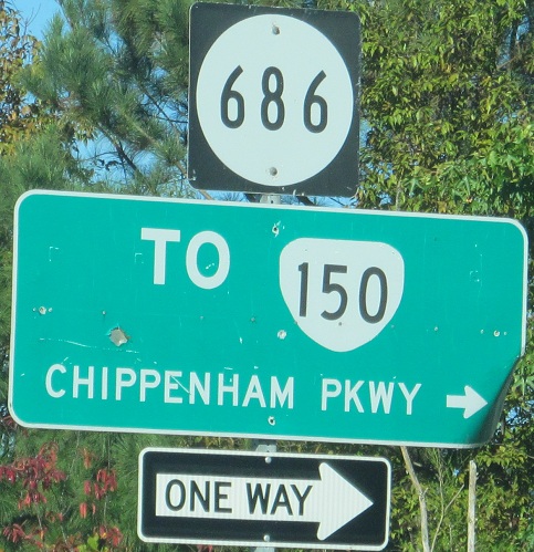 NB and SB at the same interchange. The first sign is at the top of the exit ramp and misleadingly omits the availbility of turning left. The second, mainline sign is on the only part of VA 76 you can travel for free (for ¼ mile from VA 150), this despite 150 having its own Jahnke Rd. interchange. The signs are more interesting on VA 76 anyway, with the mismatched 686 shields.