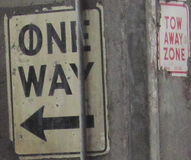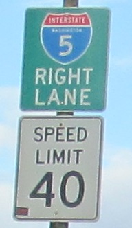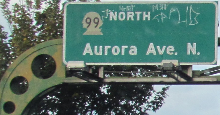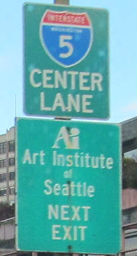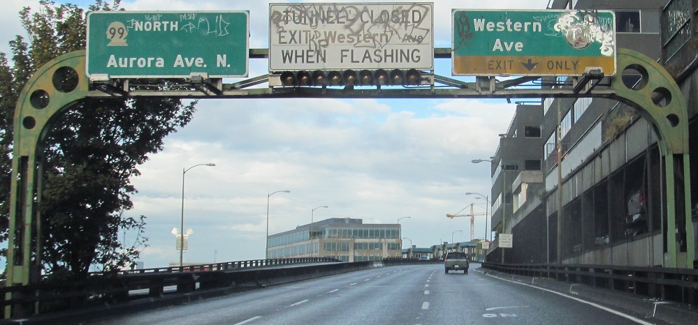 Continuing north in 2014 to delectable button copy with an ancient city seal appearing to feature the Space Needle. Hard to tell under the graffiti. This and the one north of the tunnel (click at bottom to continue north and see that) are the 1950s originals that were destroyed with the old viaduct and tunnel. I-5 is directed to the center lane prior to Western Ave. because of the Exit Only, which is why it's then in the right lane.