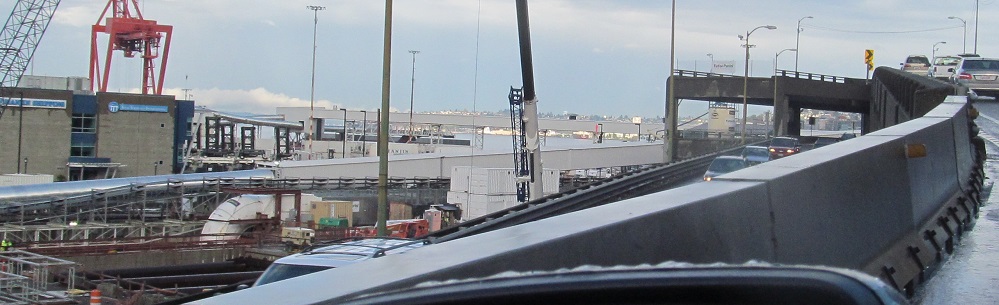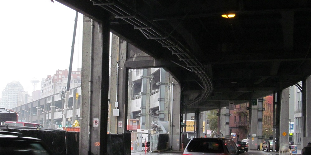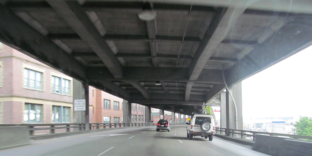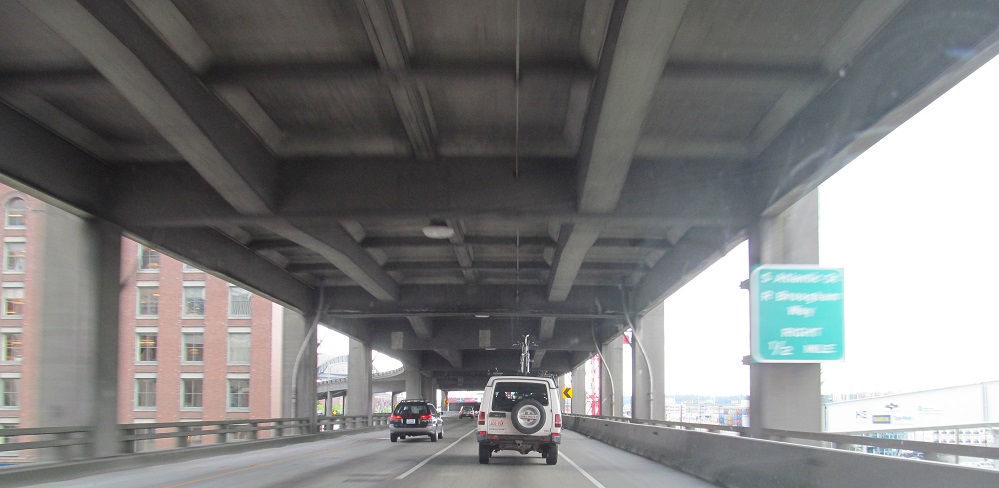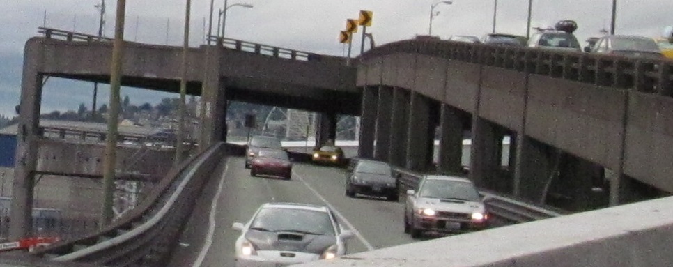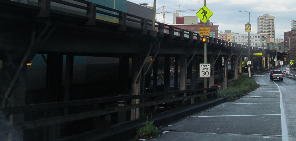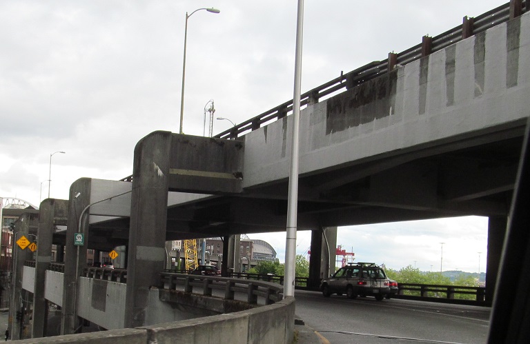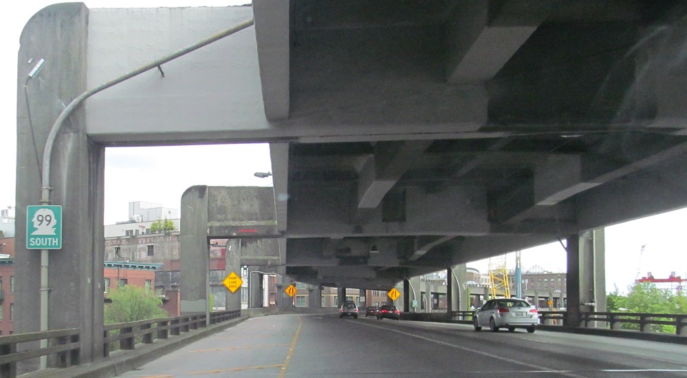 North onto the Alaskan Way viaduct in 2013, opened in stages from 1953 to 1959. The stub of what was removed for the tunnel in 2011 is most evident.