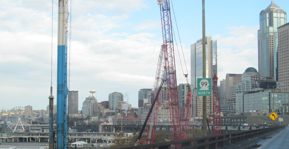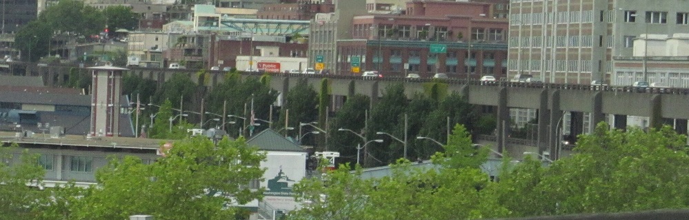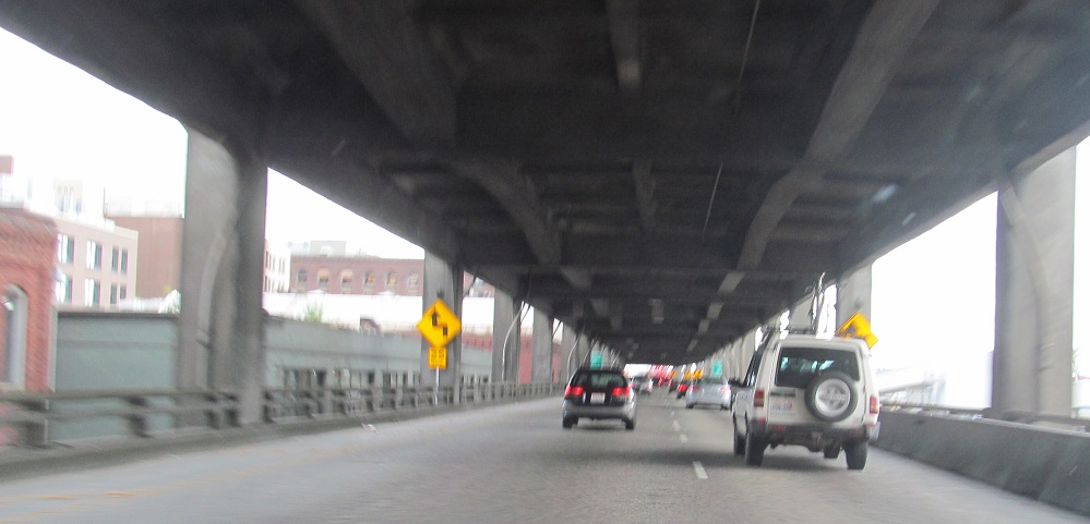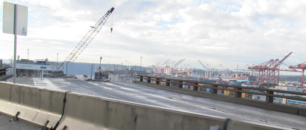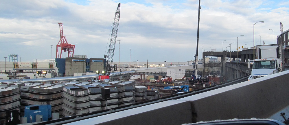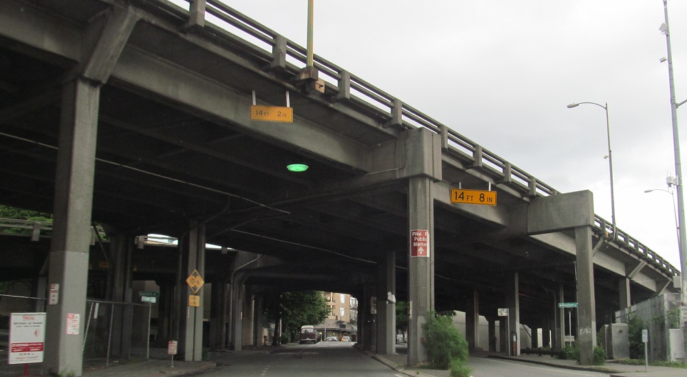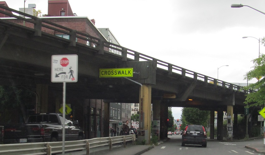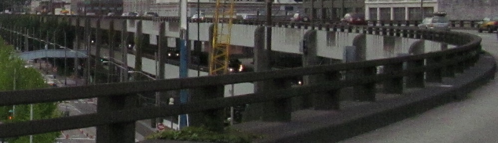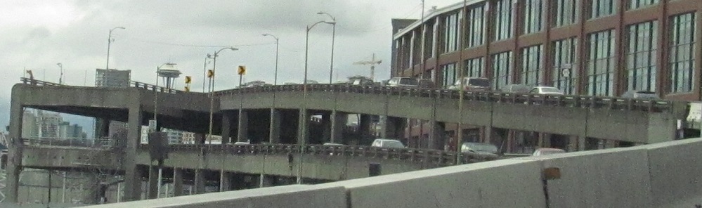North onto the Alaskan Way viaduct in 2013, opened in stages from 1953 to 1959. The stub of what was removed for the tunnel in 2011 is most evident.