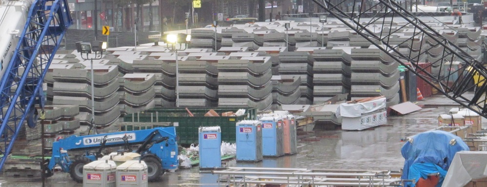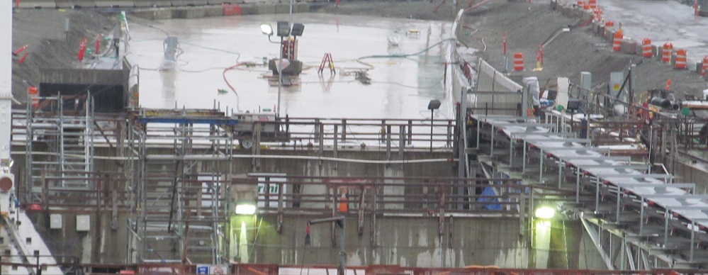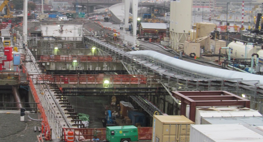 There is a whole lot of tunnel waiting to be brought into the tunnel. While all the wall pieces wait for their chance, you can see some views of the new SB tunnel exit. (NB tunnels under SB in a double-decker bore that explains the size of the TBM.) That whole wing to the east seems like a ventilation building.
