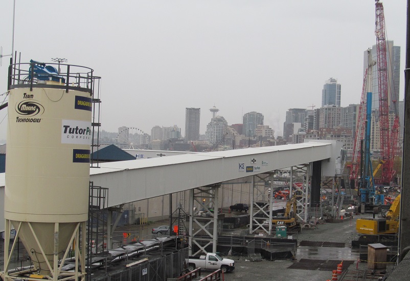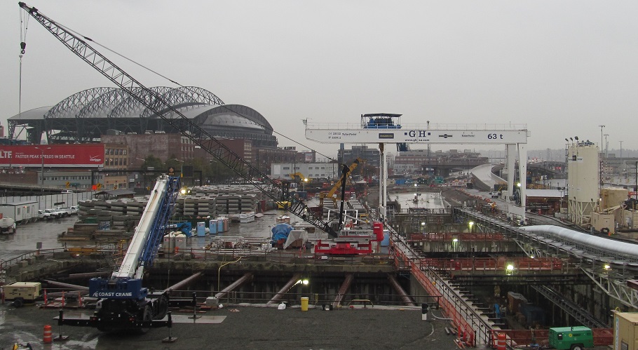 From north to southwest: the extent of Seattle's Big Dig at the time Bertha needed rescuing complete with concrete plant, industry!, the new ramp that will take (surface) Alaskan Way south from 1st Ave. up to the Colorado Ave. crossover.