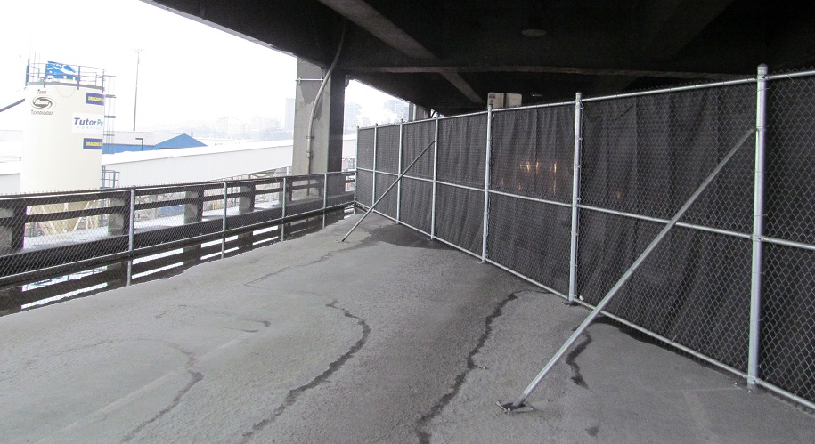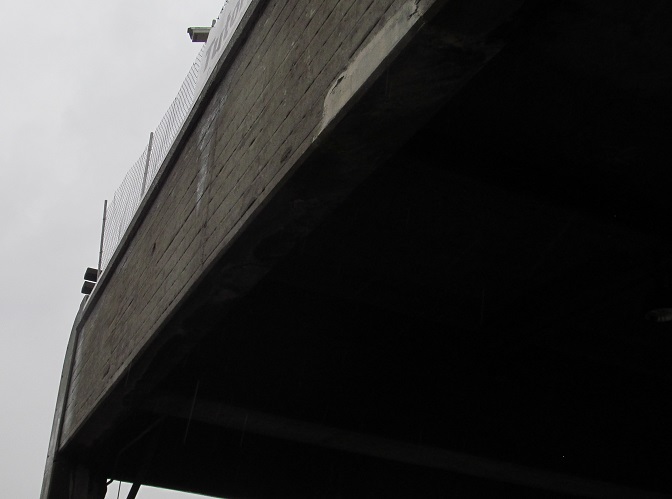 ...then out onto the still-striped stub of the southbound lanes, sheltered from rain by viaduct and from traffic by a fence. (And a barrier. It was safe.)