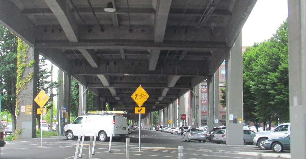 Elliott Ave. heading SE and then Western Ave. heading NW under the viaduct.