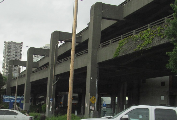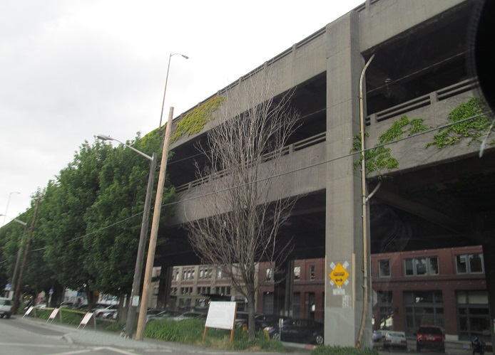 Let's explore the viaduct from the side along the Alaskan Way surface road. The bottom level is a sometimes two-way, sometimes one-way parking area. You can see how this visually divides the waterfront from the rest of the city.