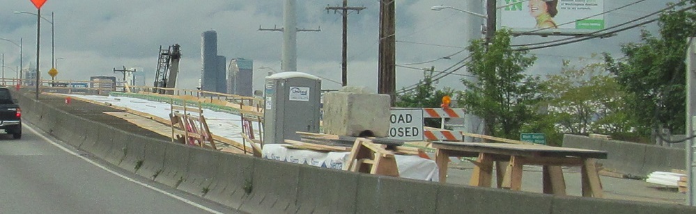 WA 99 NB entering the Marginal Way viaduct through the industrial district south of downtown Seattle, up to where the sports teams play. Until 2011, the bi-level Alaskan Way viaduct extended to about where the asphalt turns into concrete in the last photo. The recency of that change (I was there in 2013) may be why there's still construction at the south end of the viaduct. It was done as a precursor to construction of the SR 99 Tunnel to replace the remainder of the 1953 bi-level freeway, which you'll see in a moment, so that the entire highway would be on a single level through Seattle, eliminating the seismically inadequate viaduct.