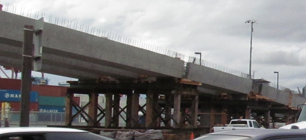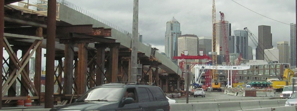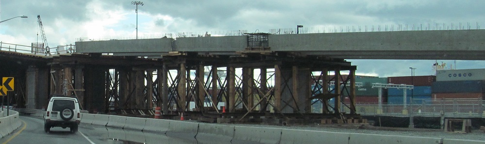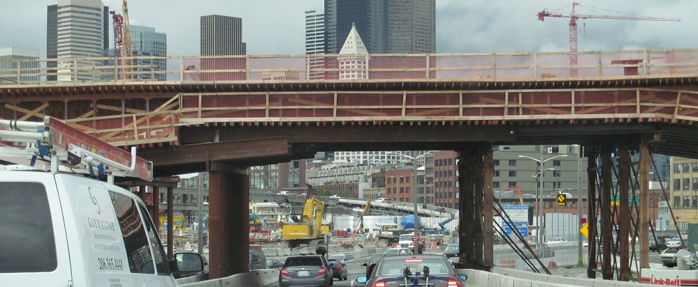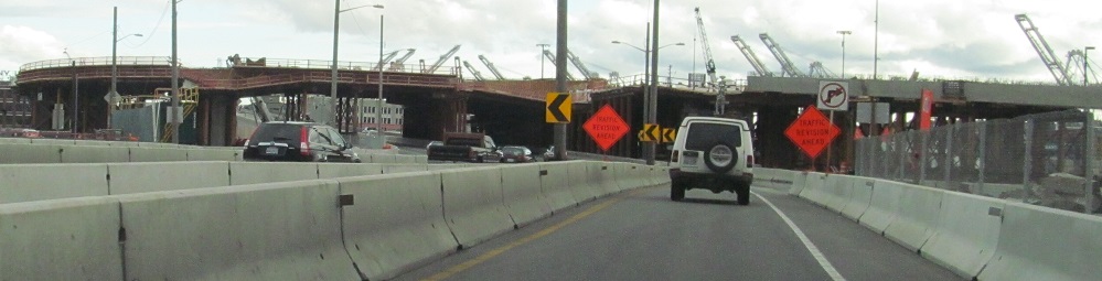 Check it out, while somehow traveling at freeway speeds: project cost $1.35 billion and completion in December 2015. The final verdict: tunnel opened 2/4/19 with viaduct demolition continuing for months thereafter, final cost around $3.3 billion. Still a walk in the park compared to Boston's Big Dig.