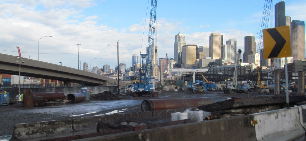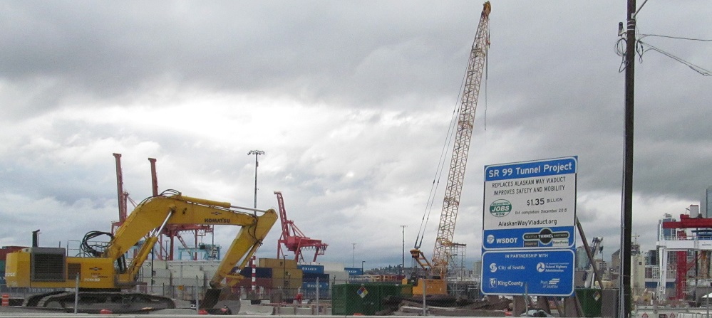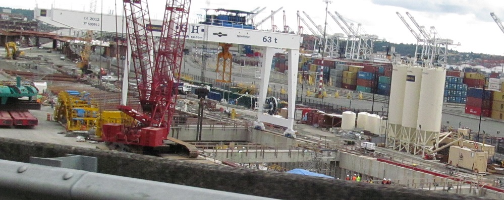 Your first glimpse of 2013 tunnel construction is NB under the future Colorado Avenue overpass, designed to connect city streets to the south end of the future Alaskan Way surface boulevard (which can be seen in the last 2 photos). The third photo stares straight down the barrel of the tunnel approach, which right now is a mess of cranes and one mean, green, tunnel-boring machine (back right), or TBM.