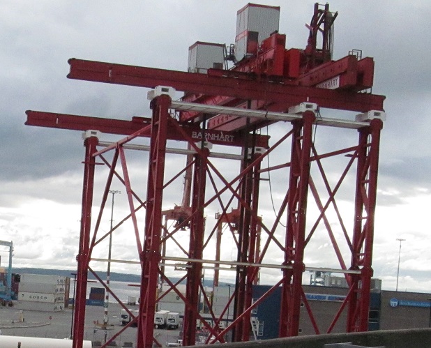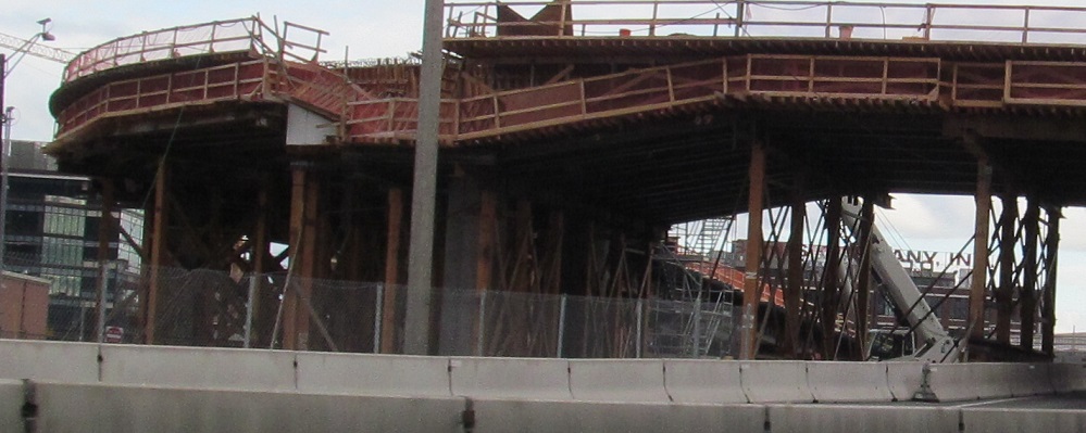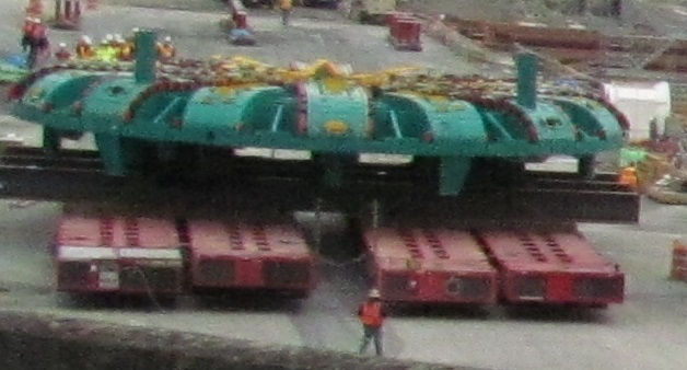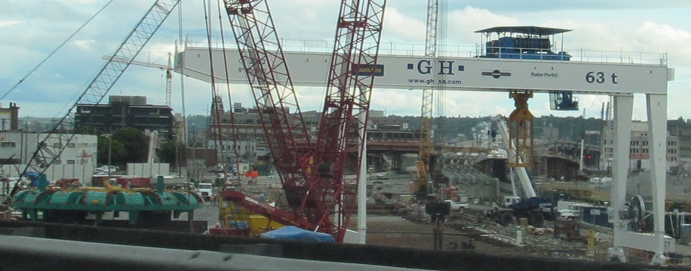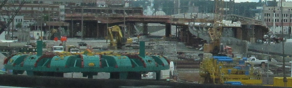 Here's a large section of the future TBM, and a giant rig set up over the southern tunnel portal, probably to stabilize the concrete pouring and/or for whatever is necessary to launch the TBM (named Bertha after a past mayor, but also because she is big) into the future tunnel.