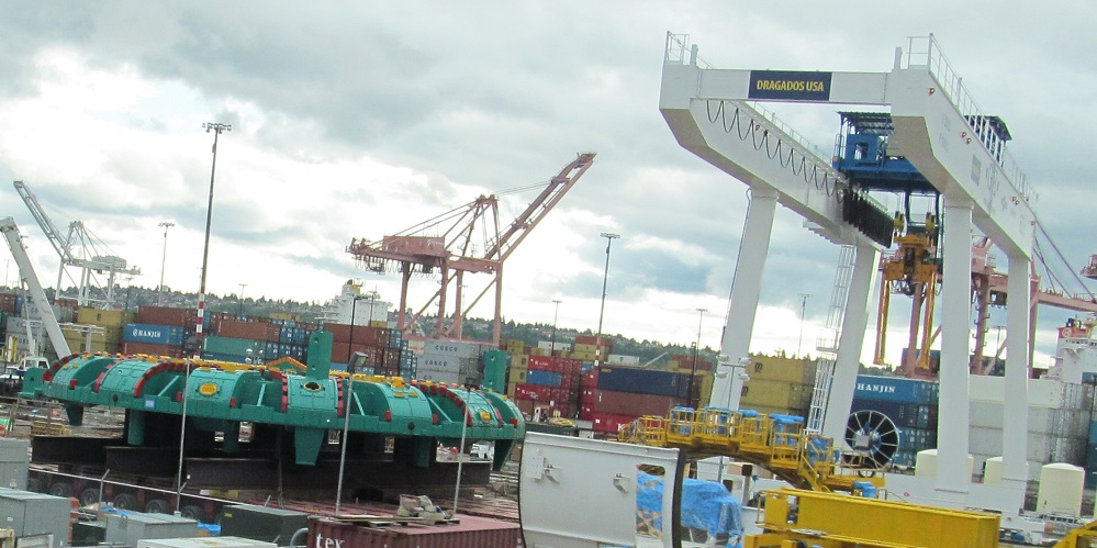 The pièce de résistance is the giant green blade that will chew through the soft muck, hard rock, and at least one unknown steel pipe that will end up causing most of the 39-month delay in tunnel construction. (The machine broke a bearing, overheated, and had to be dug out from above in an extensive 2-year process before being repaired and reinserted.) You can see the tunnel approach walls being poured and stabilized by the white rig, while the TBM will be assembled just shy of the portal to begin its large round bore. Unique to tunnels in the USA, WA 99 was bored as a two-level tunnel, SB over NB, which made the TBM the largest this country has ever seen.