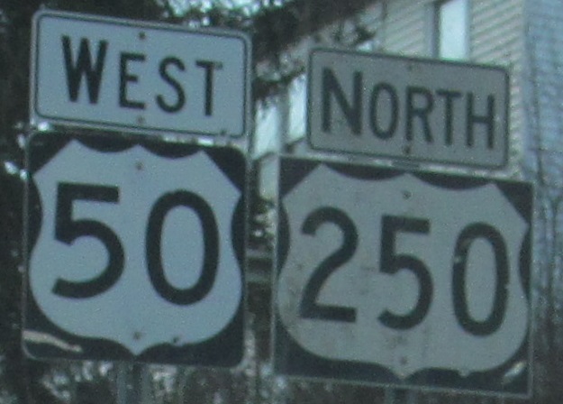 Old signs where US 250 and US 50 split in Pruntytown, and a fake sign trying to tag along below the second one. I normally lobby for old signs to be left intact, but please remove that US 250 abomination.