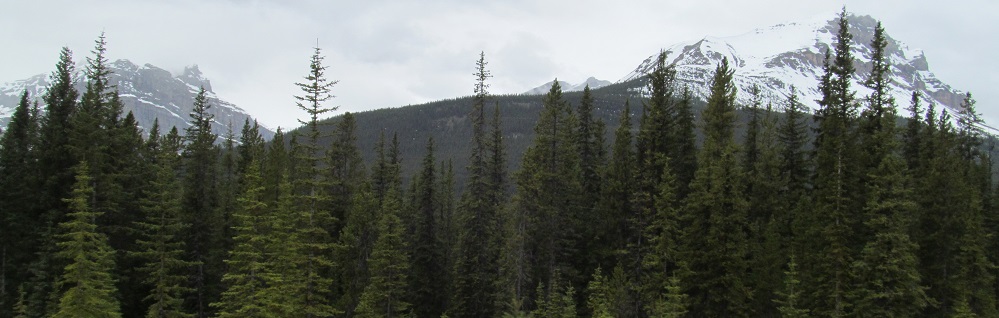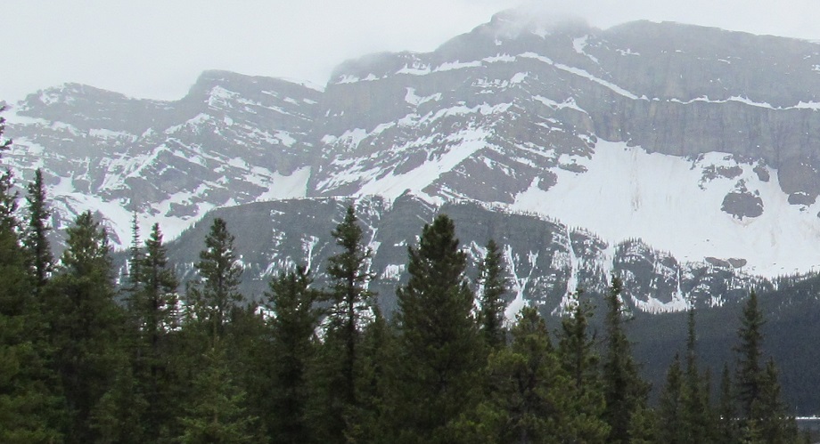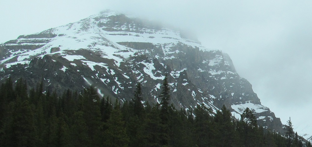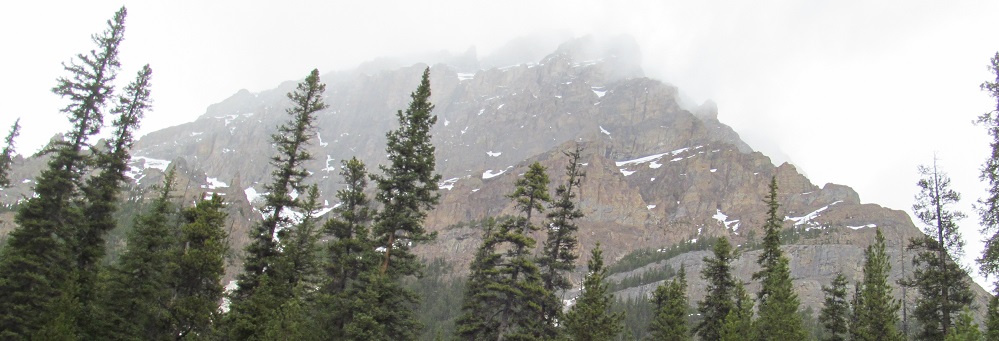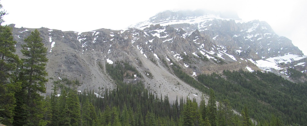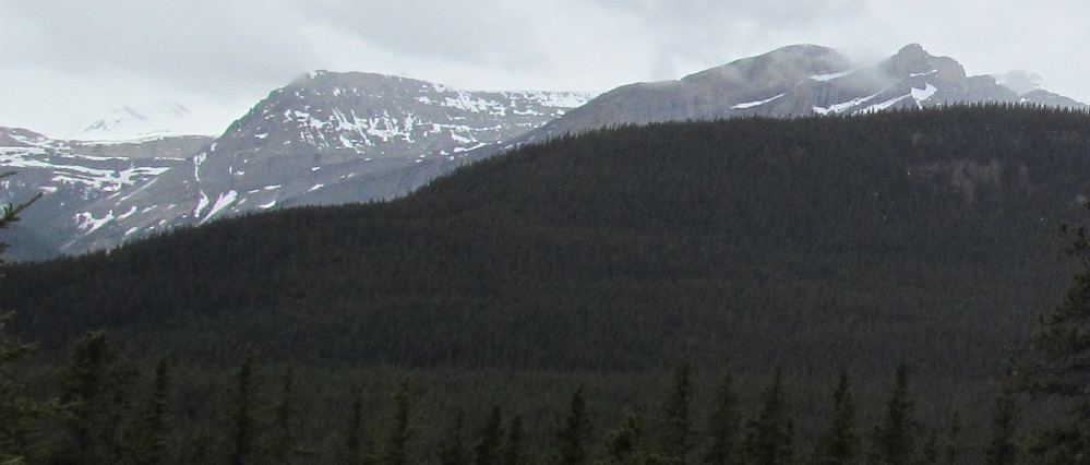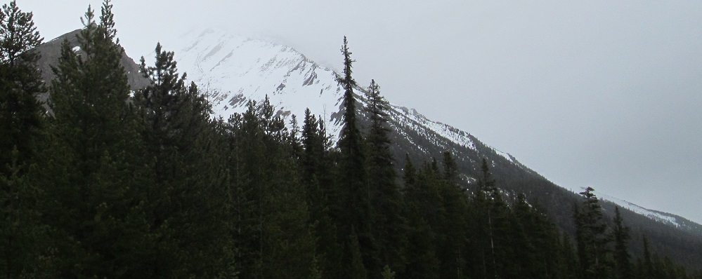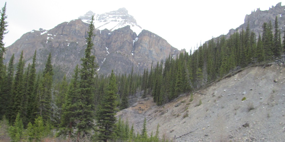 As the road takes a few twists near its junction with Trans-Canada Highway 1, I'm afforded unique views of Saddle Mountain (attached to the east side of Fairview Mountain), Lipalian Mountain (to the east, north of Highway 1), and the full Lake Louise western complex of Fairview, Saddle, and Temple.