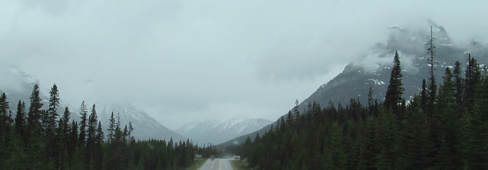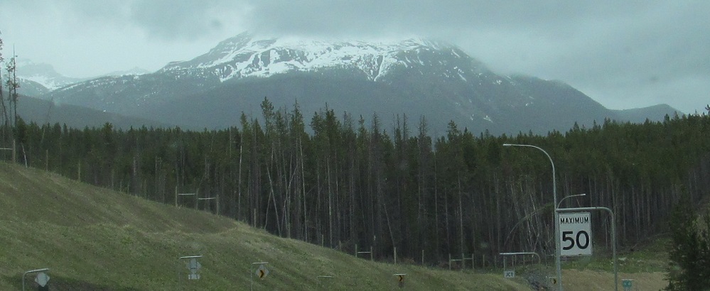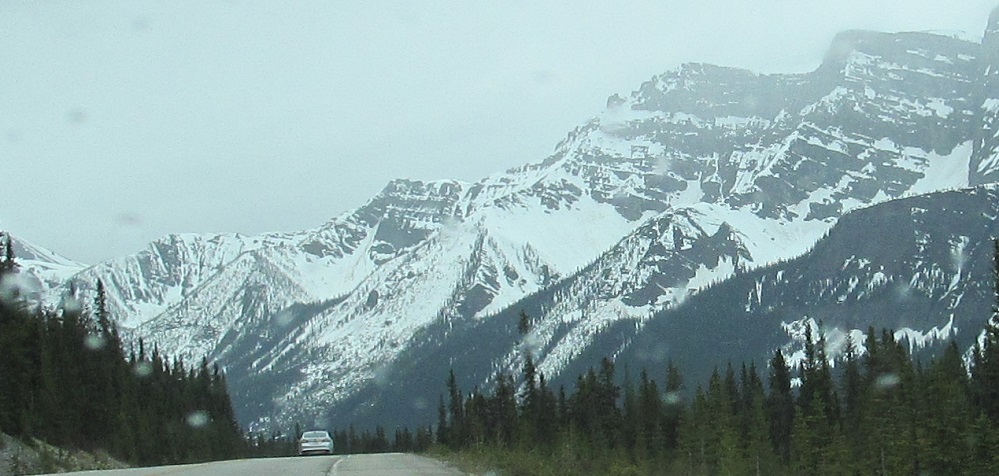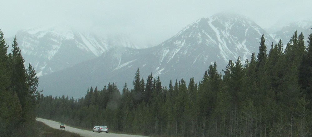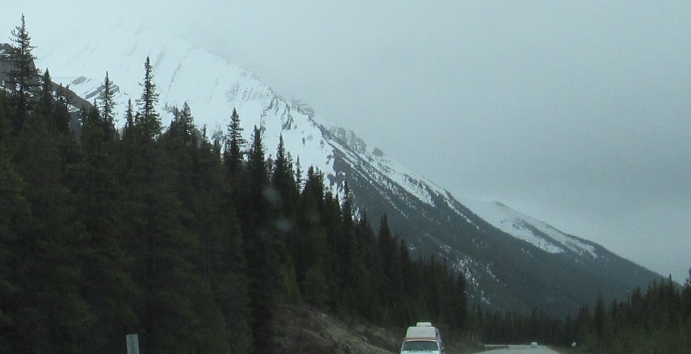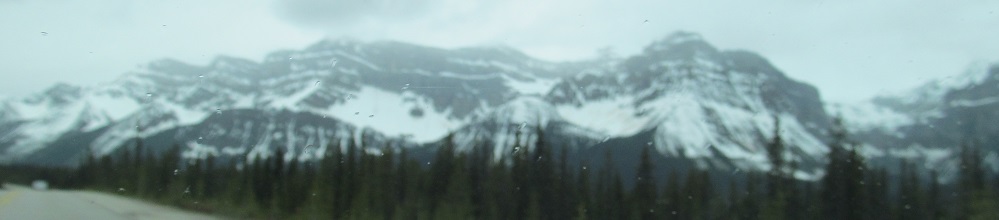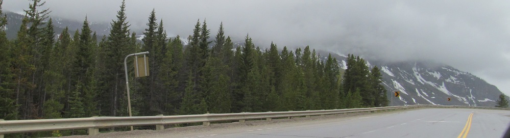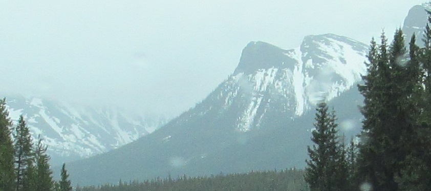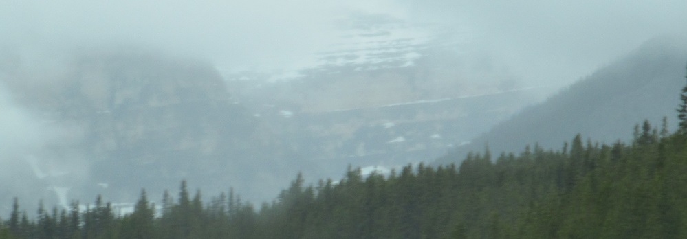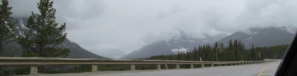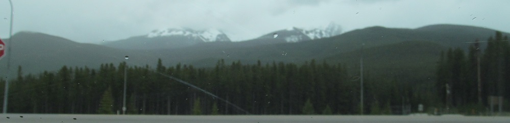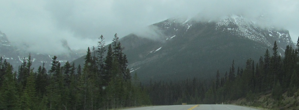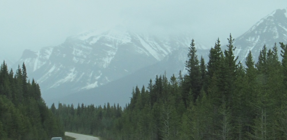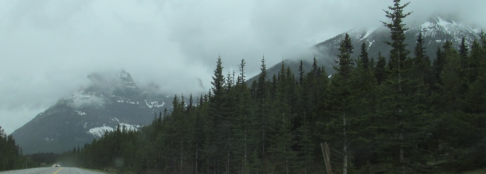 Highway 93 now has completely new scenery and a new name: Banff-Windermere Highway. Mt. Whymper is straight ahead, Boom Mountain is to its right, and in the last photo, Storm Mountain is to the left and enshrouded in mystical water droplets. This whole stretch of highway to the border is less than 10 kilometres, so it shouldn't surprise you that all of these mountains are in BC.