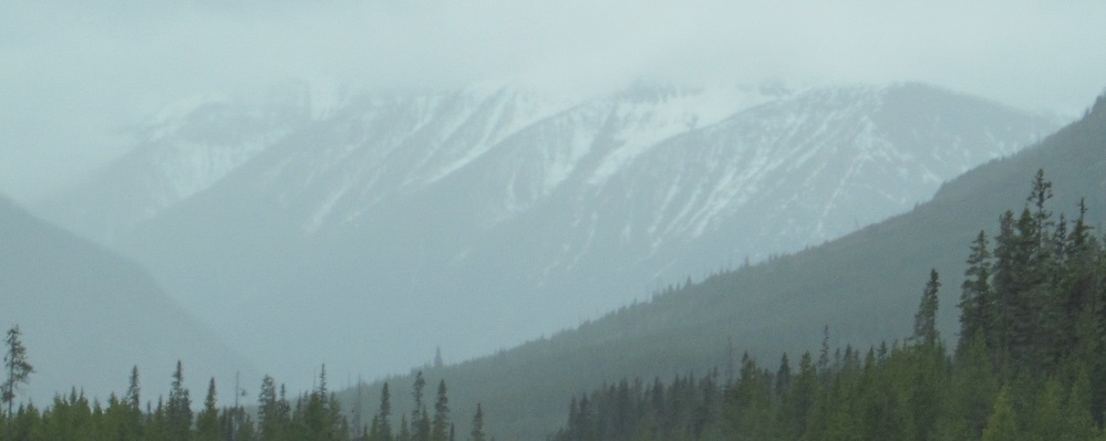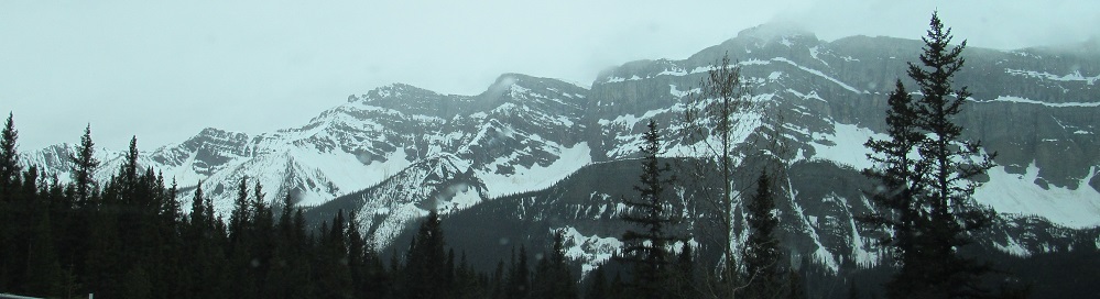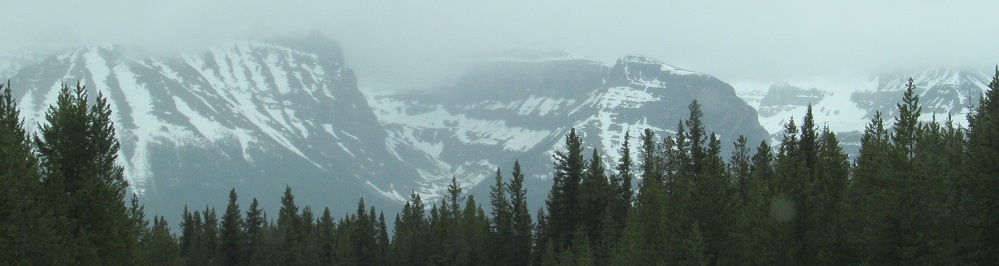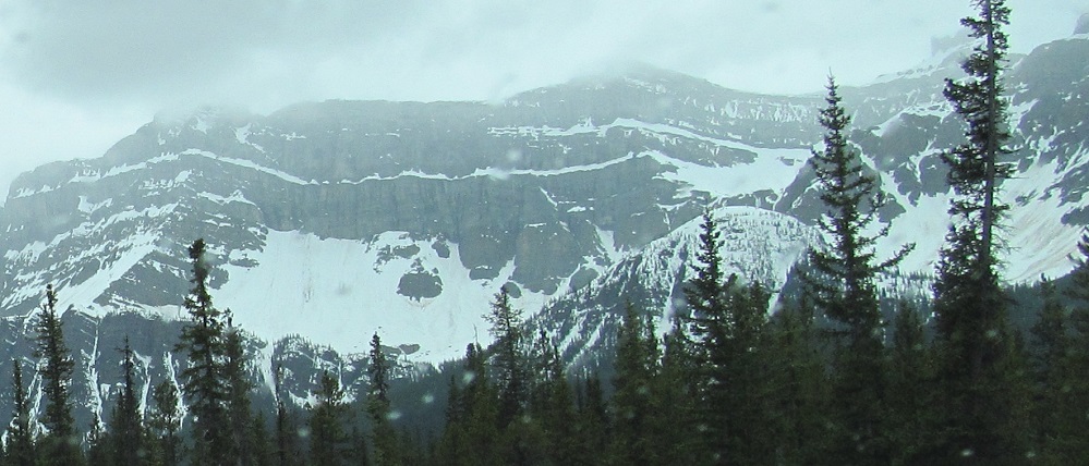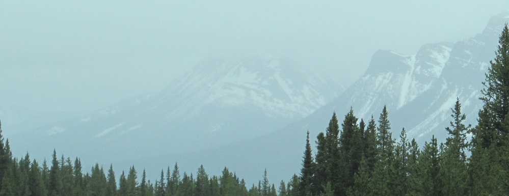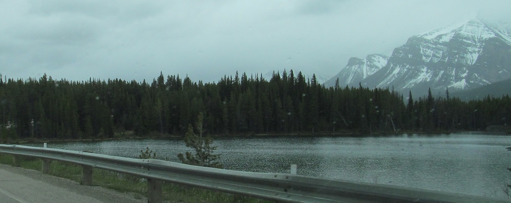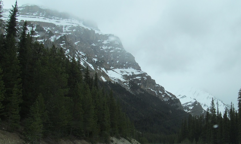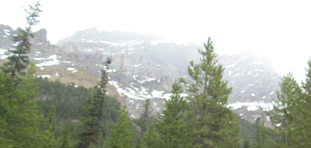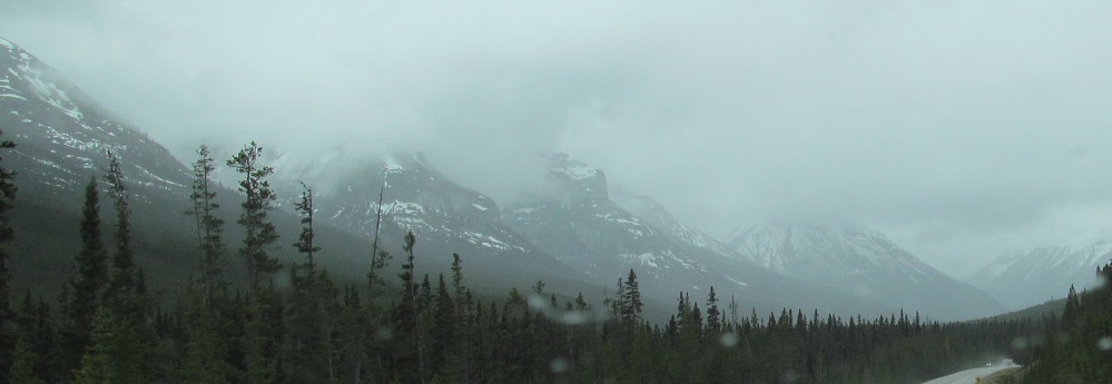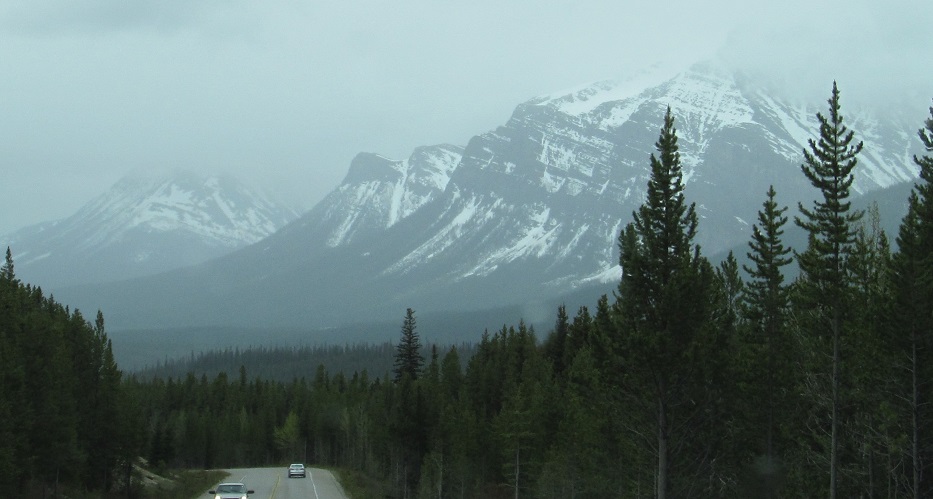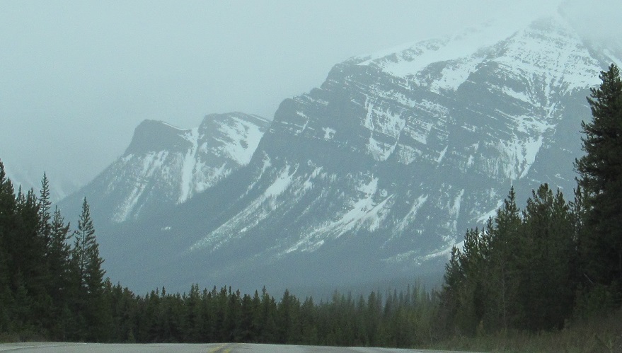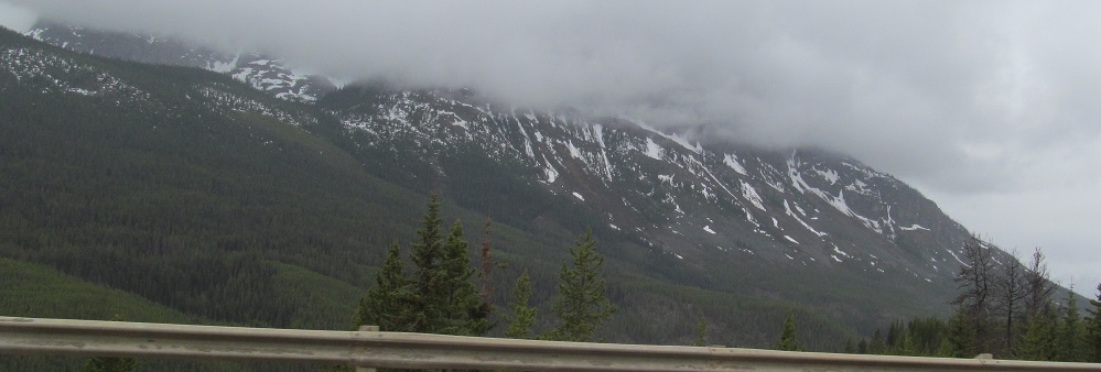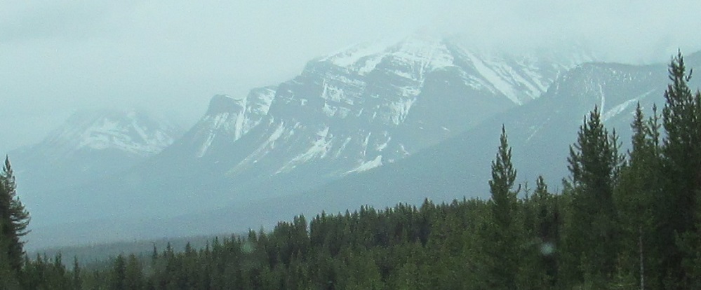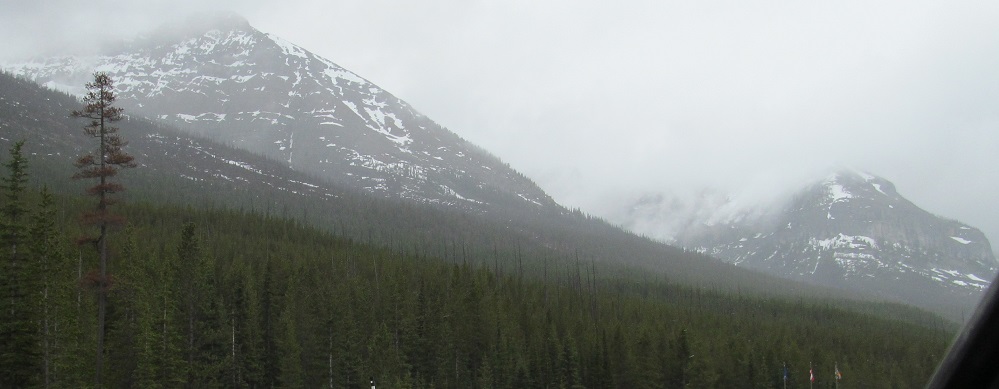 Highway 93 now has completely new scenery and a new name: Banff-Windermere Highway. Mt. Whymper is straight ahead, Boom Mountain is to its right, and in the last photo, Storm Mountain is to the left and enshrouded in mystical water droplets. This whole stretch of highway to the border is less than 10 kilometres, so it shouldn't surprise you that all of these mountains are in BC.