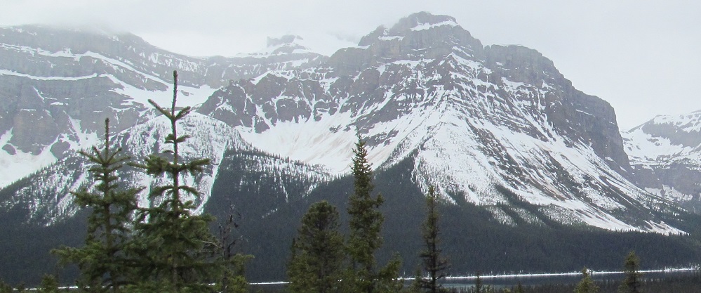 A new set of mountains is taking shape on the west side of the road: Waputik Peak in front of me, connected to Pulpit Peak to the right, overlooking Hector Lake. Bow Peak is to the northwest in the last photo.