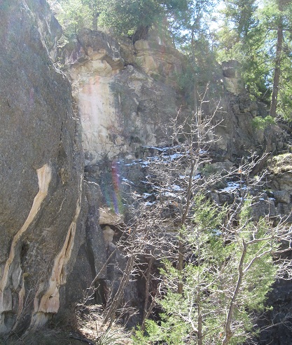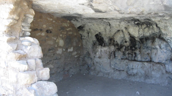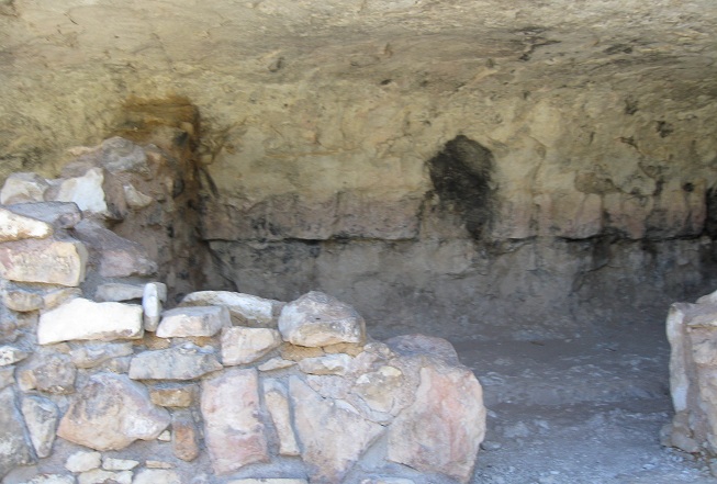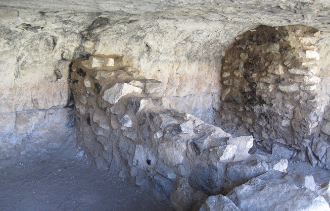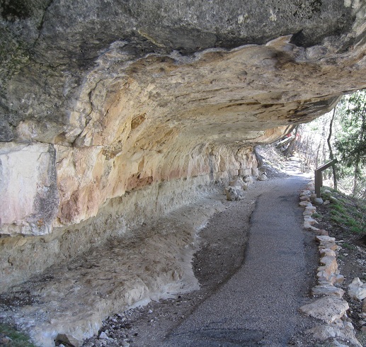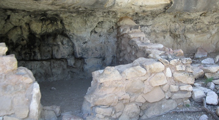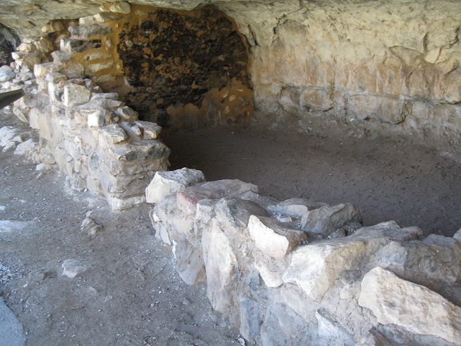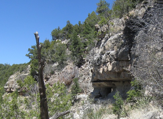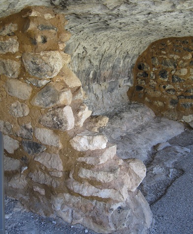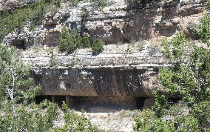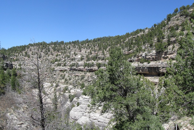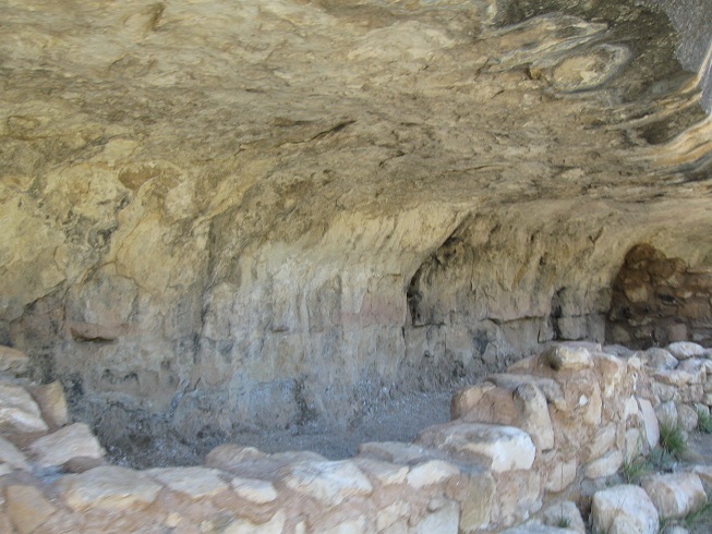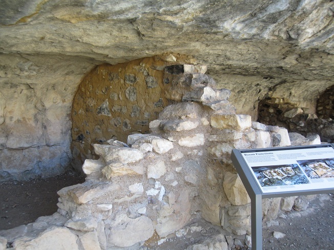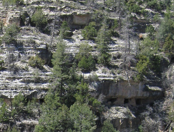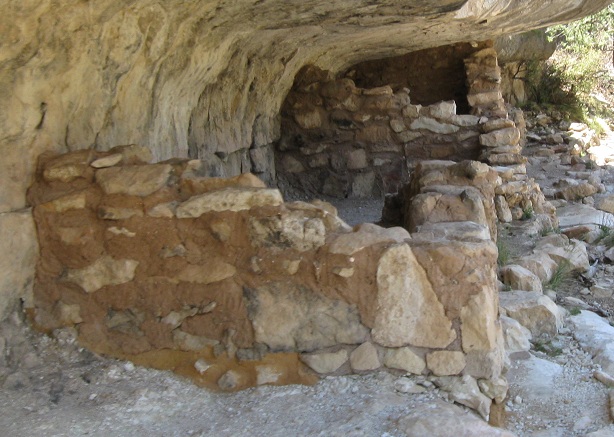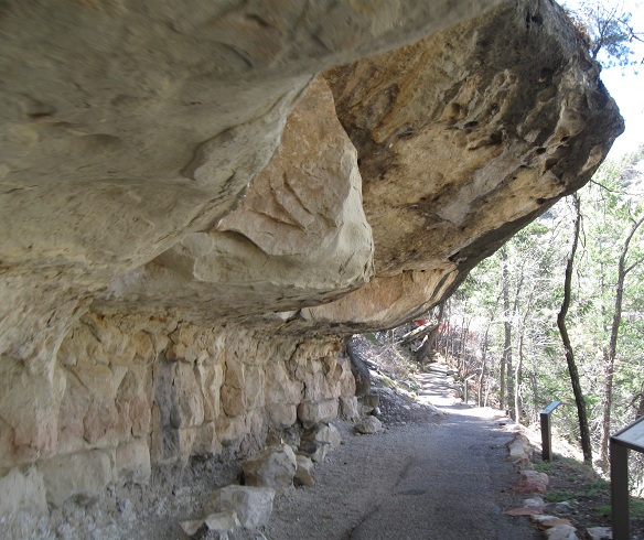 Looking west as the trail begins, several rock dwellings are visible in the next canyon over. There is a trail to this area, but it is perfunctorily blocked with a message to not enter. There are plenty of Sinagua dwellings to be had along the main trail anyway, and the National Park Service has left well enough alone by simply posting educational plaques without disturbing or dressing up the history. As on the eastern/left side of the trail, it's apparent from these views that some rooms are different than others. I'm inclined to think the long rooms in both cases are not dwellings, but rather meeting rooms, healing rooms, or similar (or all-purpose rooms - anything other than dwellings).