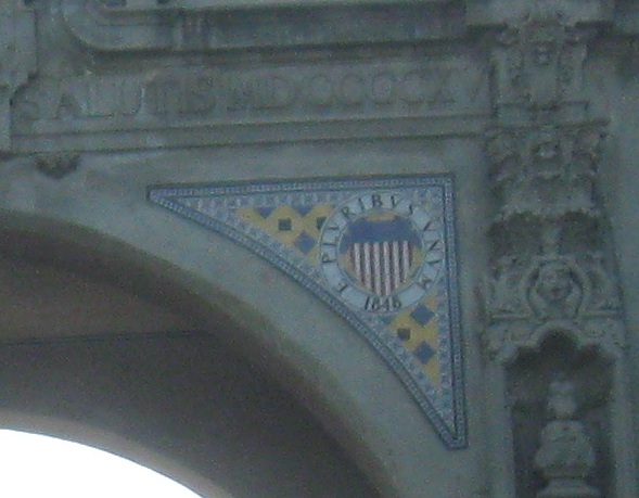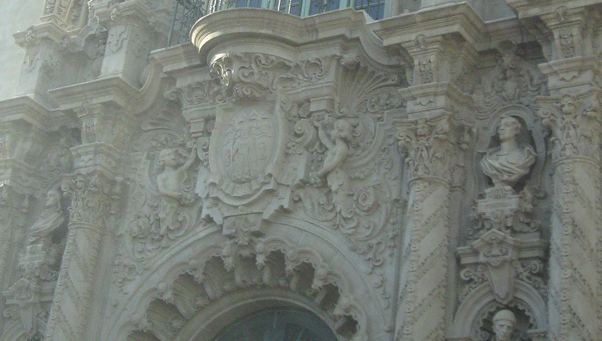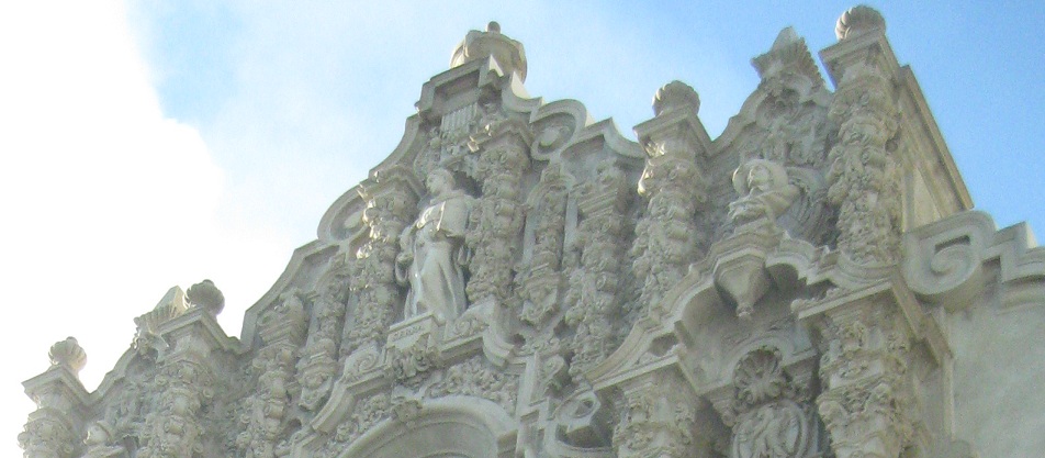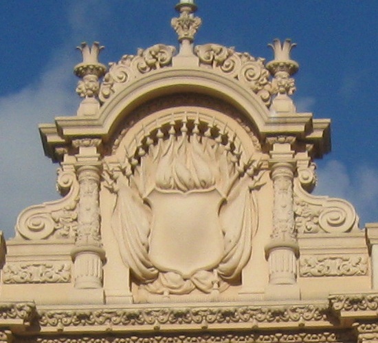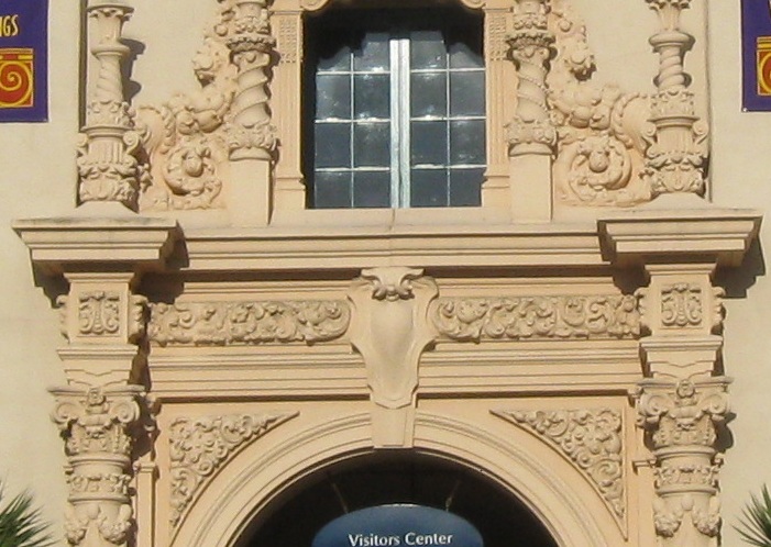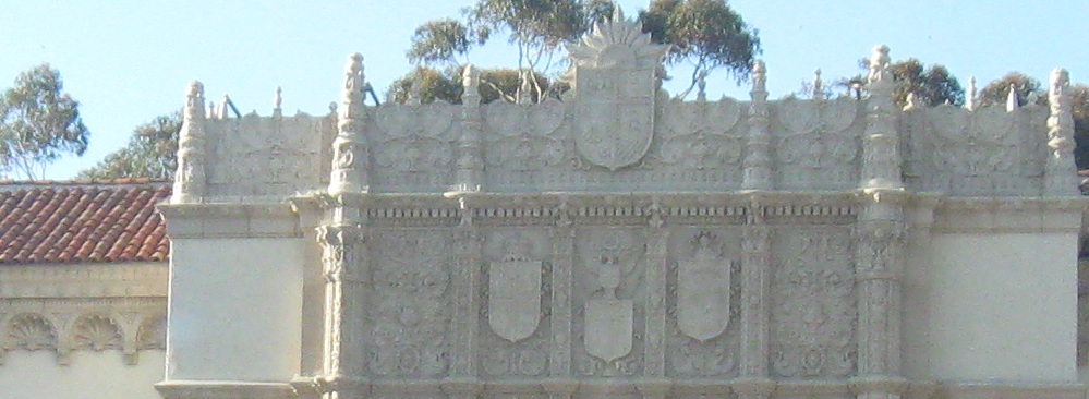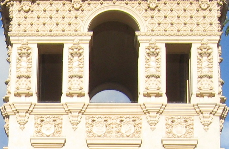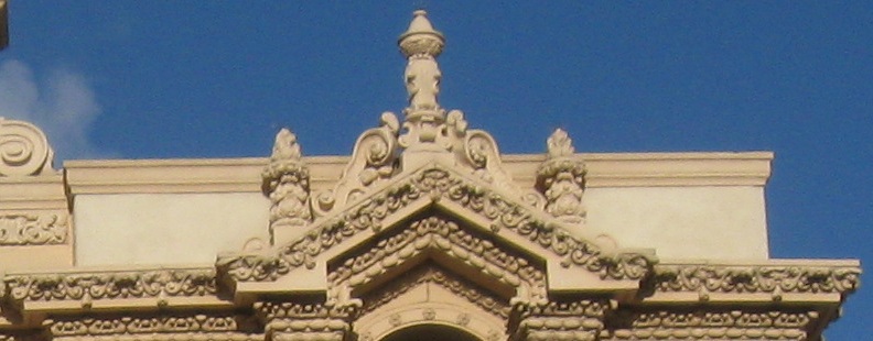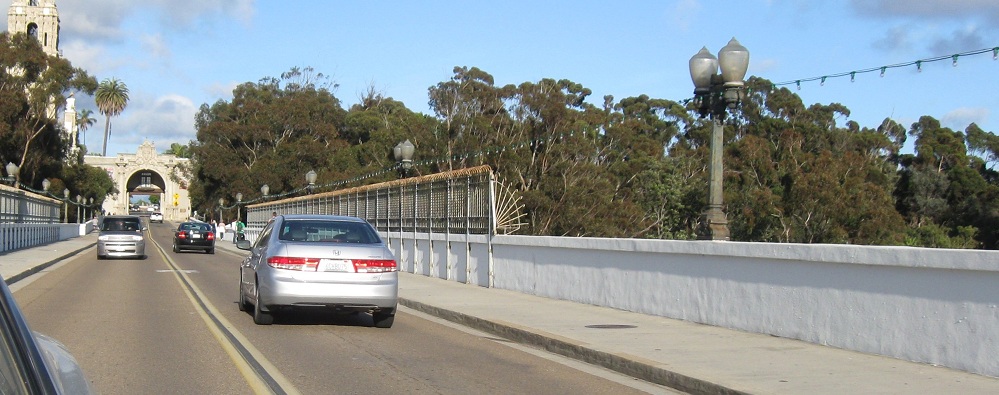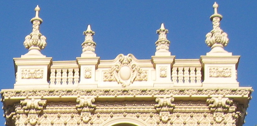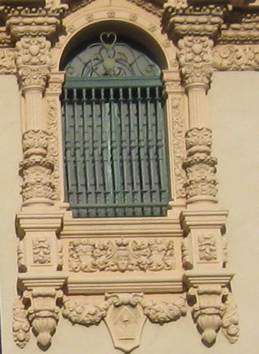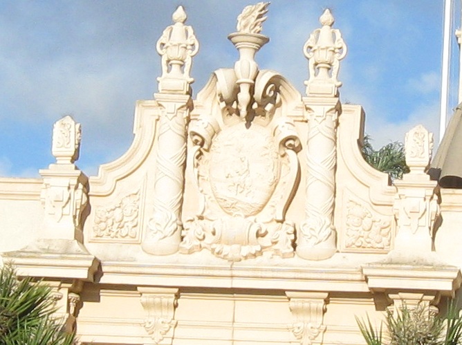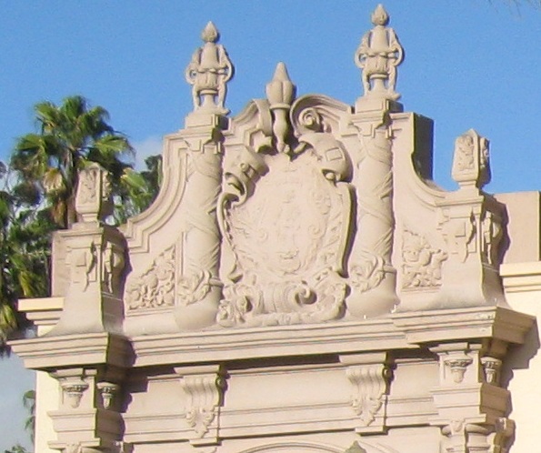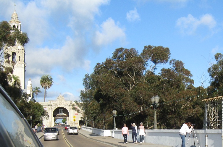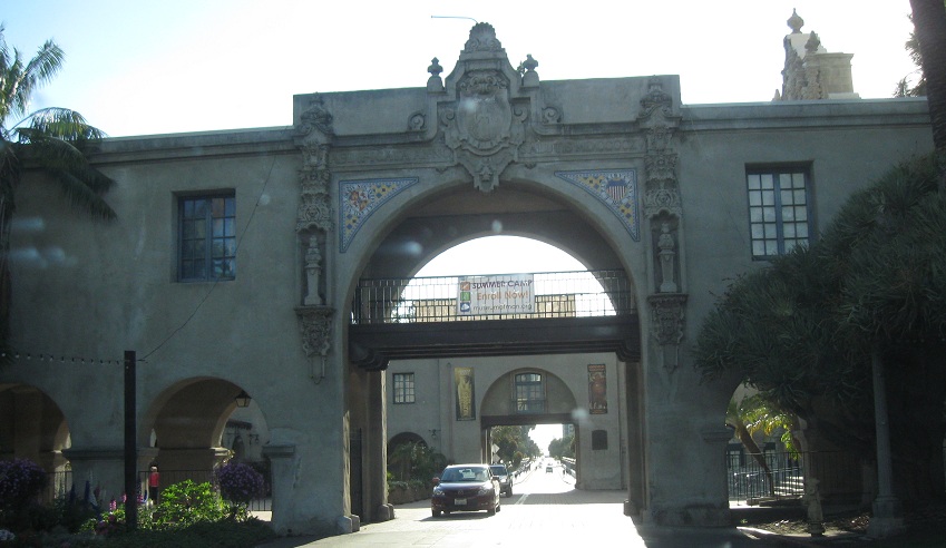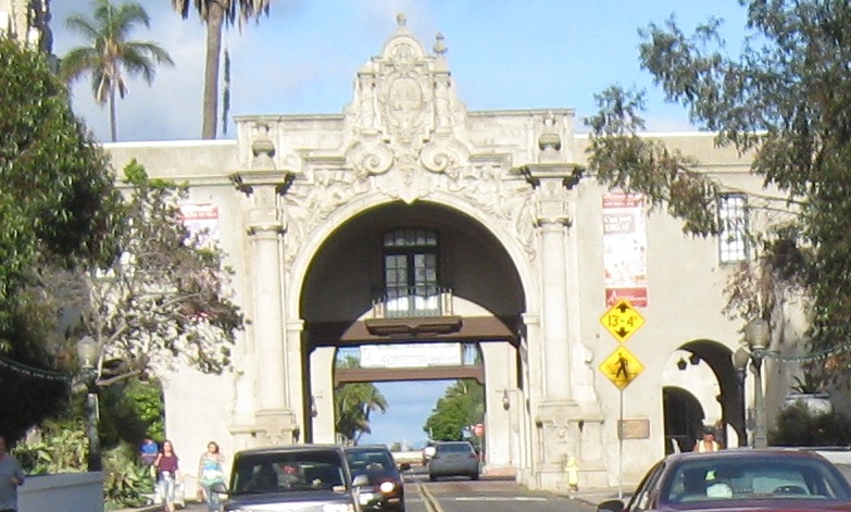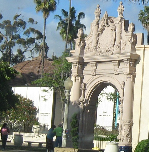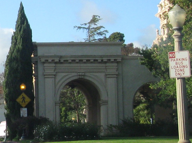 Exiting Plaza de Panama through the West Gate, the most ornate and most popular because it bridges west across Cabrillo Canyon and connects Balboa Park to downtown. It's also the most gatelike entrance to the plaza.