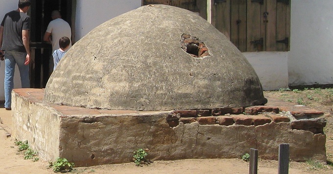 Inside the courtyard and back out. The adobe beehive is really an oven.