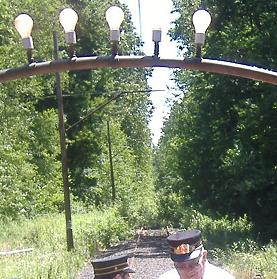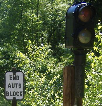 Past the Yard Limit, past the embossed Auto Block sign with a signal next to it (Auto Block is something that a Yard would do), and out to the open track. And then, to the end of the restored track. Another half-mile to mile is still clearcut through the trees, and then I can't find a trace of the original alignment on aerial photography.