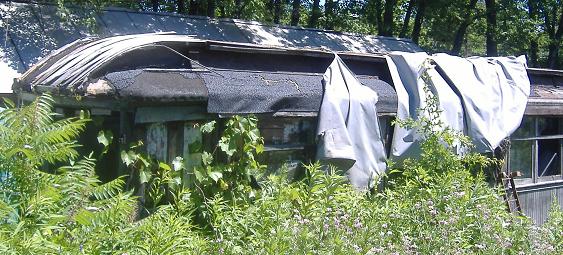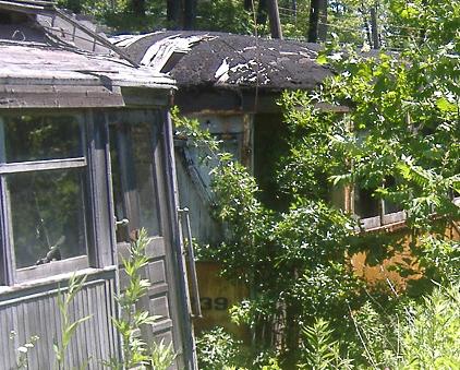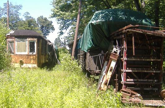 Heading farther east into the woods, alongside the restored railroad tracks, these cars are about as far out of repair as they can be and still stand upright on their own.