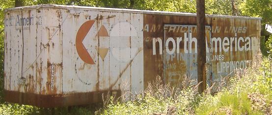 Even farther along the tracks from there, cars that desperately need a new coat of paint. The North American Van Lines trailer gets to choose how old it wants to be, since enough of the original paint job shows through.