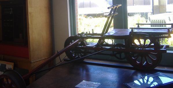 This is a three-wheeled, two-man inspection car (I'm sorry, velocipede, which sounds like I should be squishing it under my boot); one man pumps, and the other watches the tracks to take notes of damage. It's made of white ash with iron wheels and held together with bolts. Operationally, though I don't quite understand what the caption means, the side shaft is removable to change direction and allow other equipment to pass. The car weighs 140 pounds, and was made by the Sheffield Velocipede Car Company, Three Rivers, MI. It's a shame that no Velocipede companies survive.