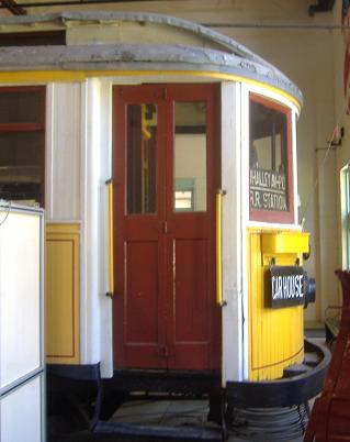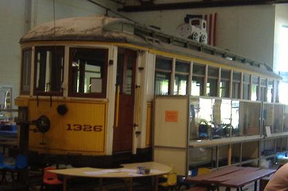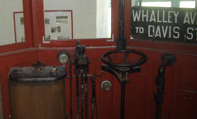 The front, back, inside, and driver's area of a 1910 Connecticut Company car. As you can see, the driver changed the destination by hand, with plates like in this photo series and atop this page. This all-wood car was made by the Osgood Bradley Company, and operated in New Haven (until service ended in 1948) and Waterbury (into the 1960's, I believe). As you may be able to make out in the third photo, the driver can close himself off from the passengers, and force them to exit out the rear sliding door (it's a double-ended car, so it can be driven from either end). The car operated with a motorman up front and a doorman in back until the Depression, when to save money the car operated with only a motorman, and thus ditched the sliding doors. Luckily, the doors were saved for reinstallation upon purchase by or donation to the Museum.