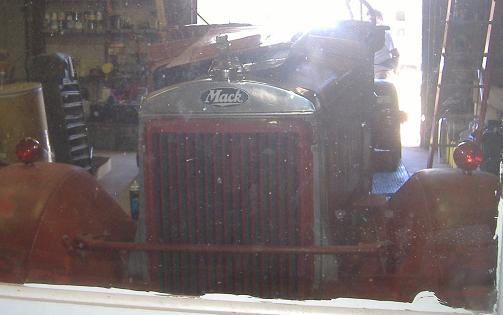 This truck sits in the maintenance garage, viewable from outside or inside through windows or doors.