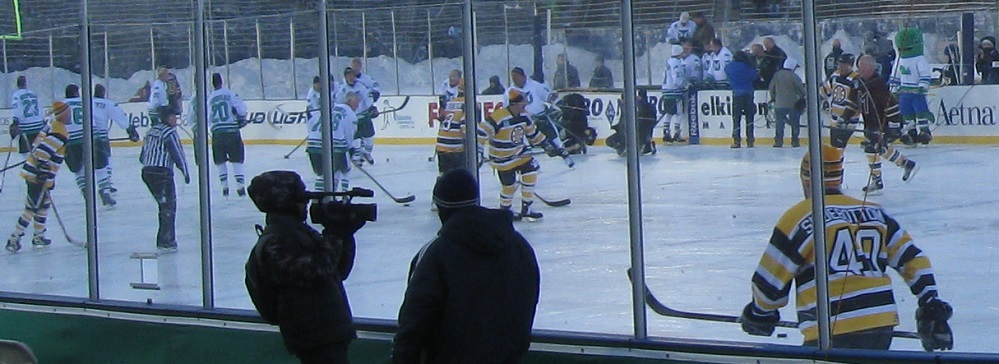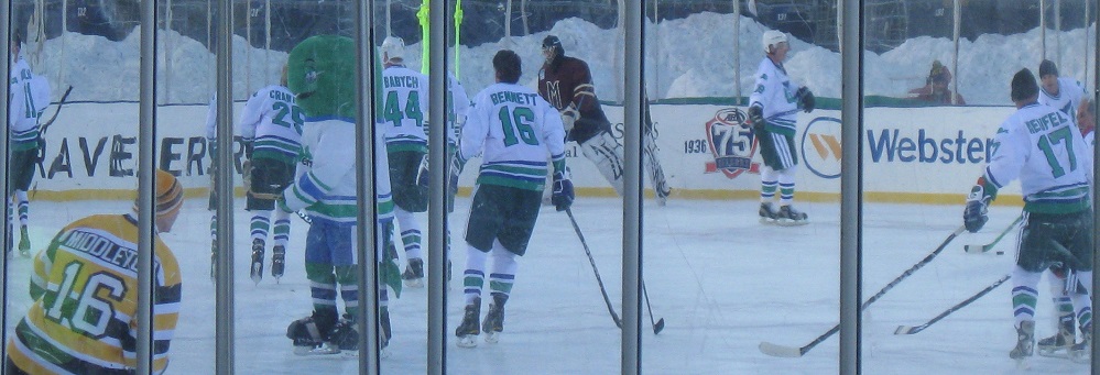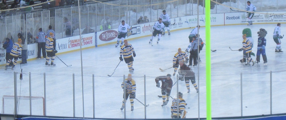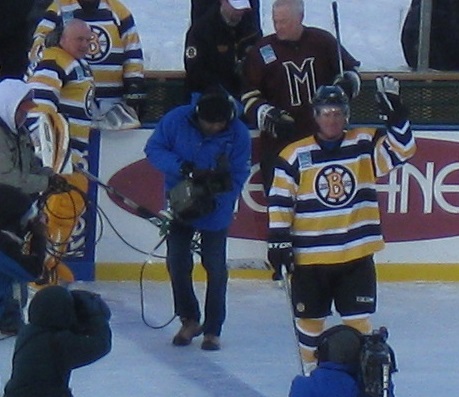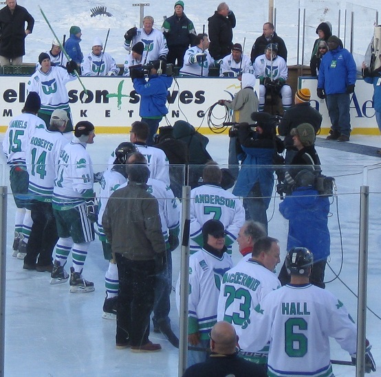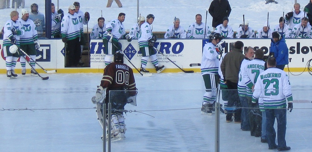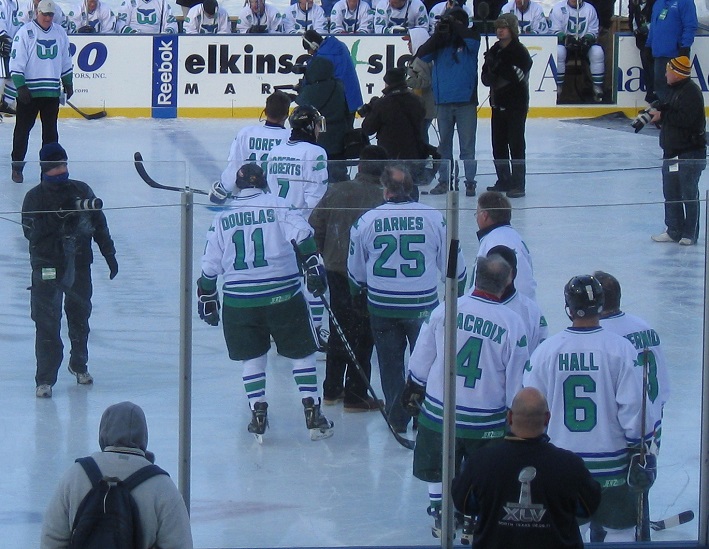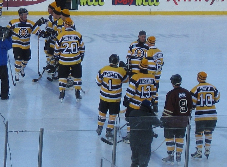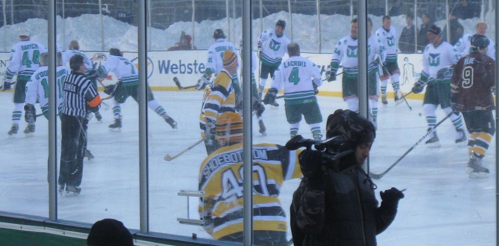 Maroon sweaters are for celebrities joining the warmups (more on that on the next page). Evidently the Bruins couldn't find enough alumni to play for them. I'll note that several joint alumni played for the Whalers, which is as it should be.