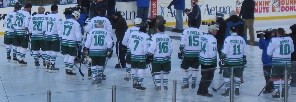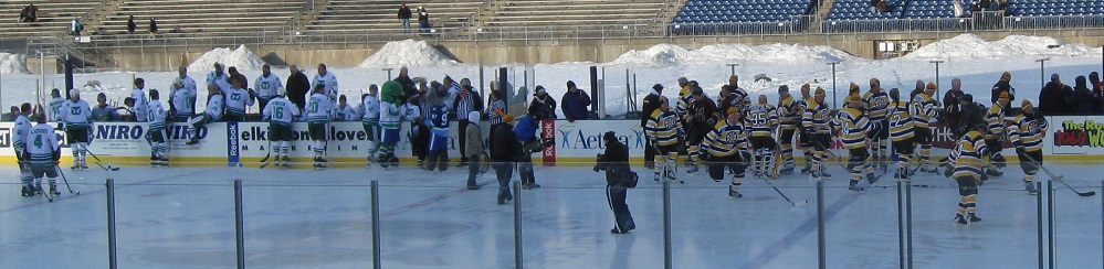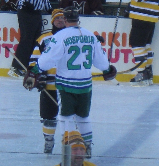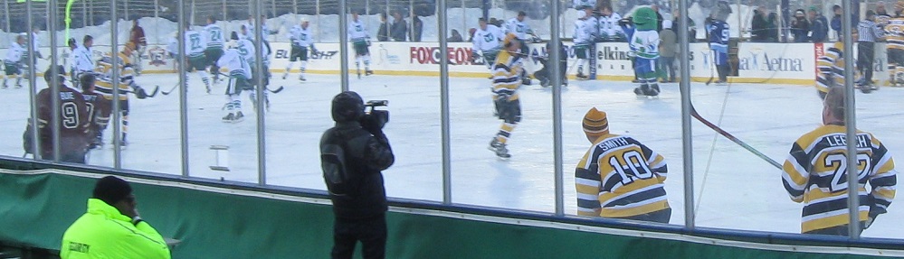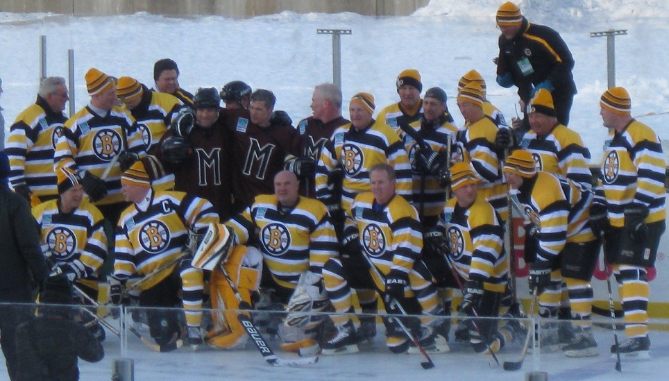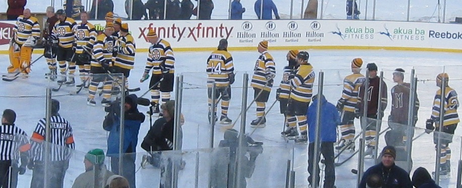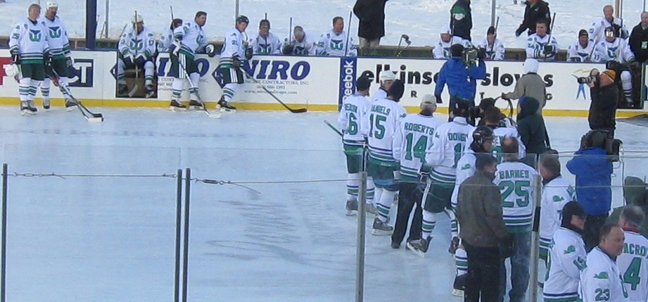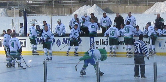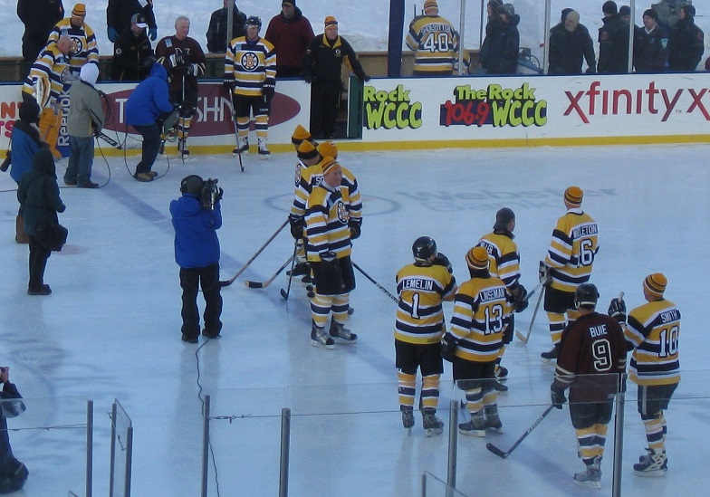 Maroon sweaters are for celebrities joining the warmups (more on that on the next page). Evidently the Bruins couldn't find enough alumni to play for them. I'll note that several joint alumni played for the Whalers, which is as it should be.