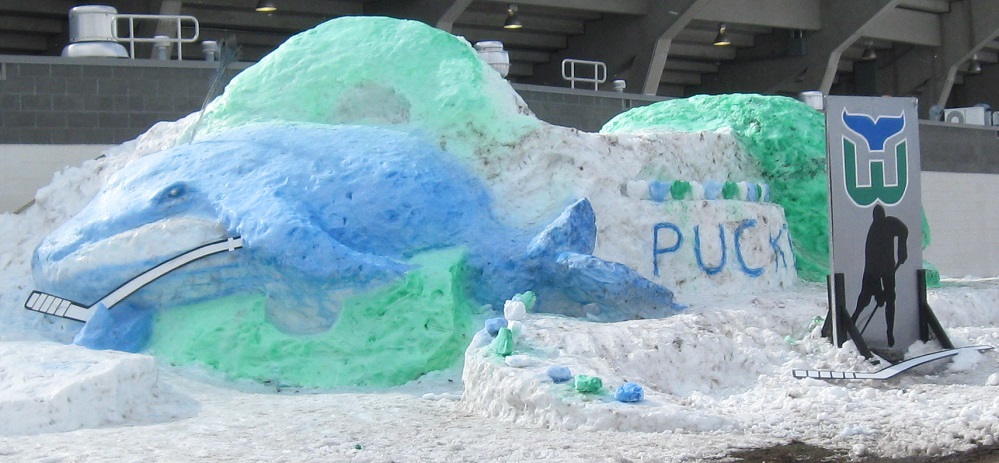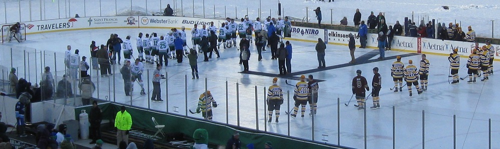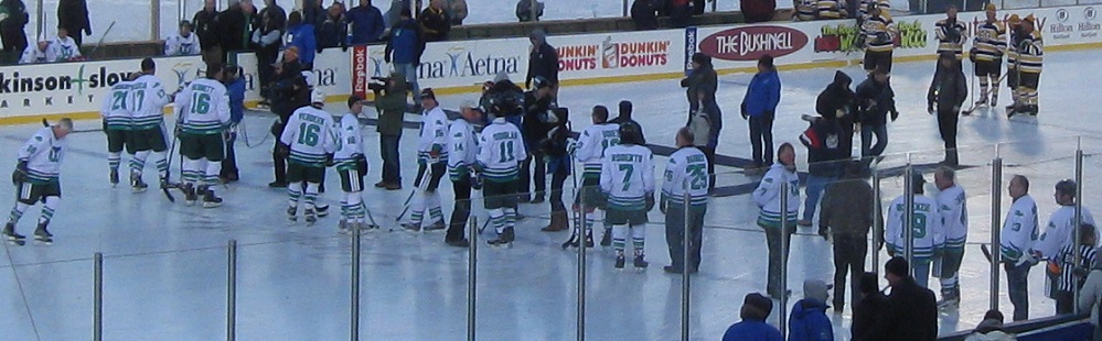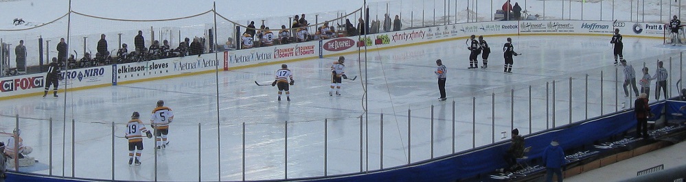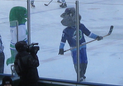 Some fans elected to sit in the stands opposite the rink, but that made little sense to me. Here's the view they would have had, getting progressively better as I approach the rink where Bruins (beehive) and Whalers alumni are warming up, joined by Pucky the Whale and CT Whale mascot Sonar (formerly and later the Hartford Wolf Pack mascot). The spirit of the Whalers is alive and well in Connecticut. Brass Bonanza was played.