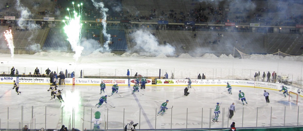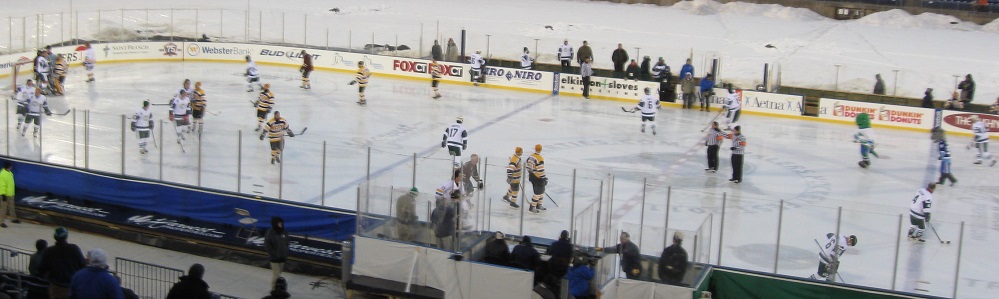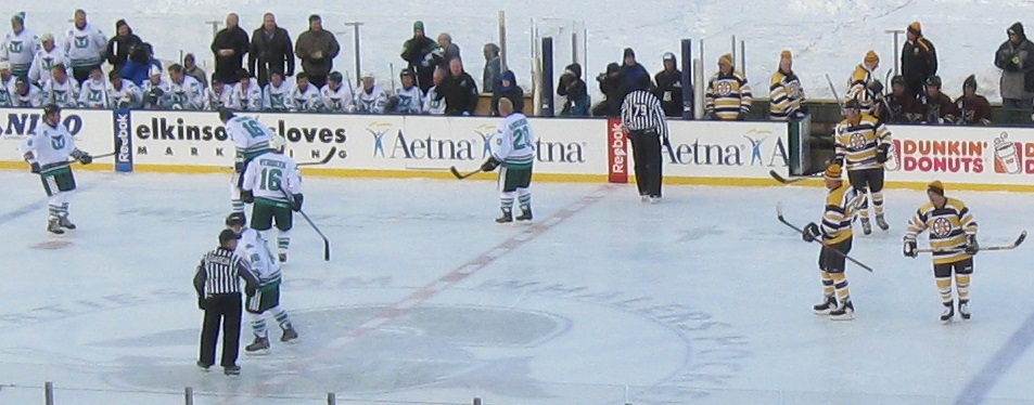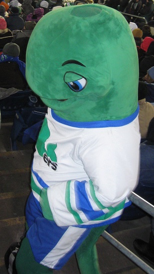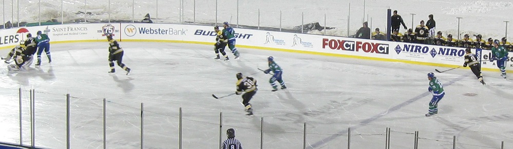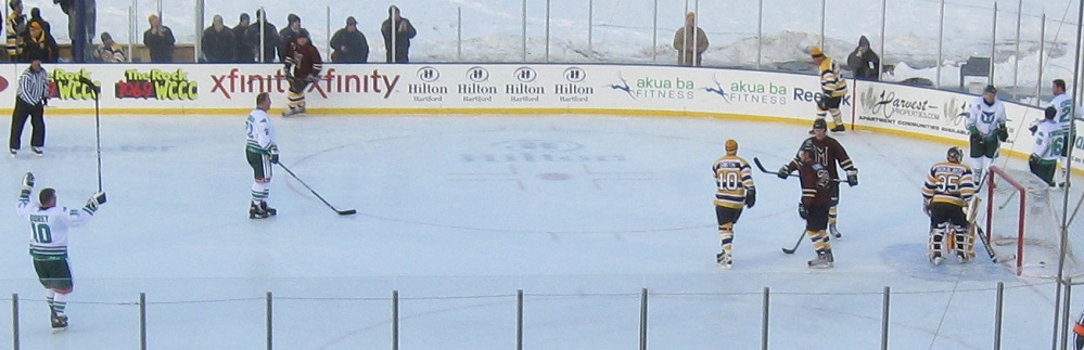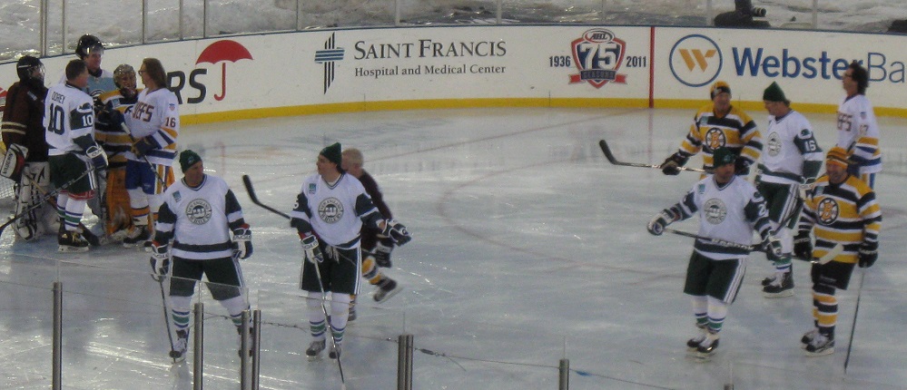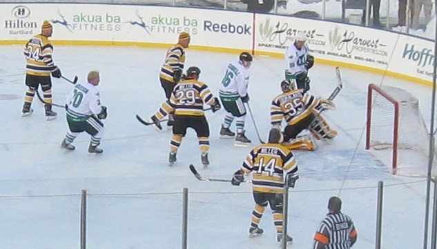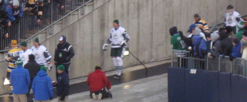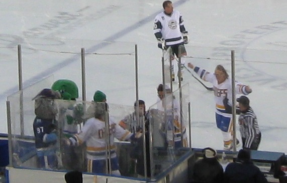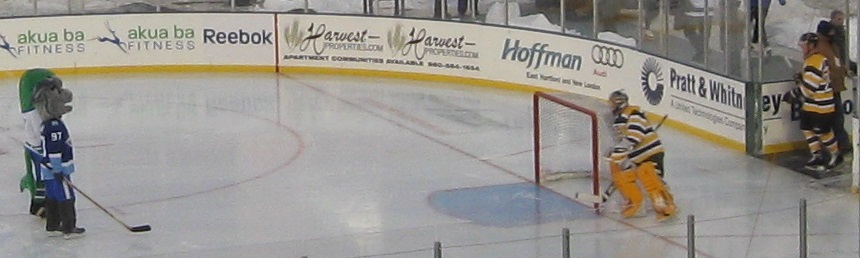 Pucky and Sonar greet all the players as they come in for the second half. Thanks to the layout of Rentschler Field and the rink, everyone uses the same entrance. Fortunately, even in the games that matter, adversaries play nicely when confronted with this situation. Whalers players come out dressed in their original New England WHA jerseys, while the Bruins are still bees.