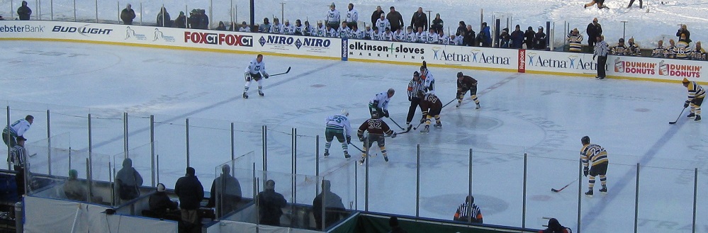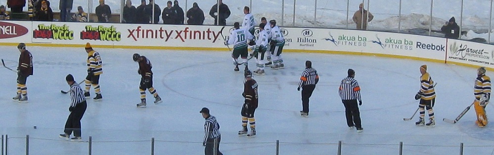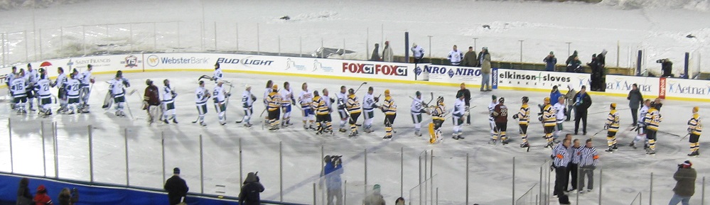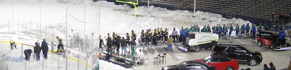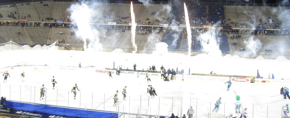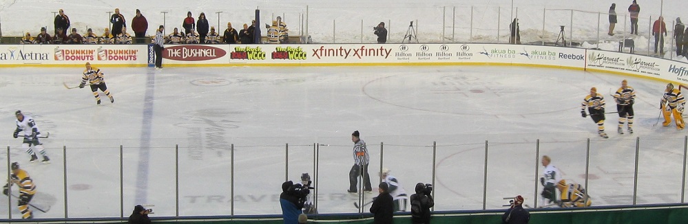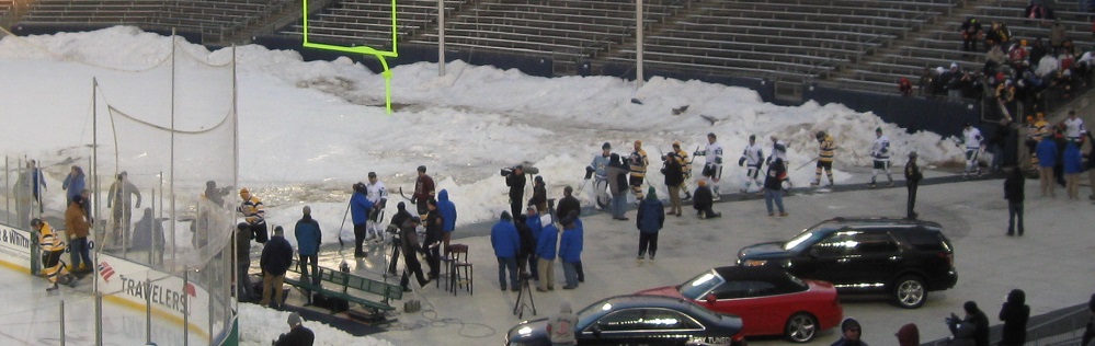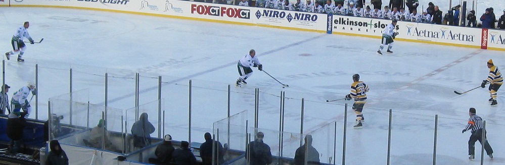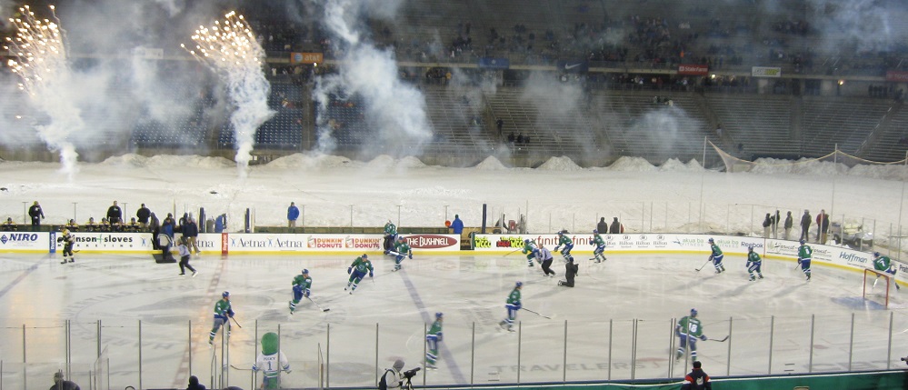 Pucky and Sonar greet all the players as they come in for the second half. Thanks to the layout of Rentschler Field and the rink, everyone uses the same entrance. Fortunately, even in the games that matter, adversaries play nicely when confronted with this situation. Whalers players come out dressed in their original New England WHA jerseys, while the Bruins are still bees.