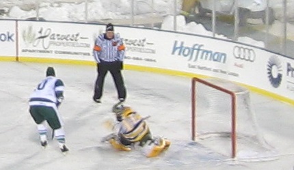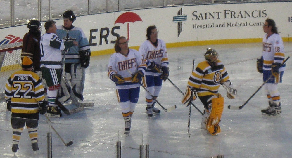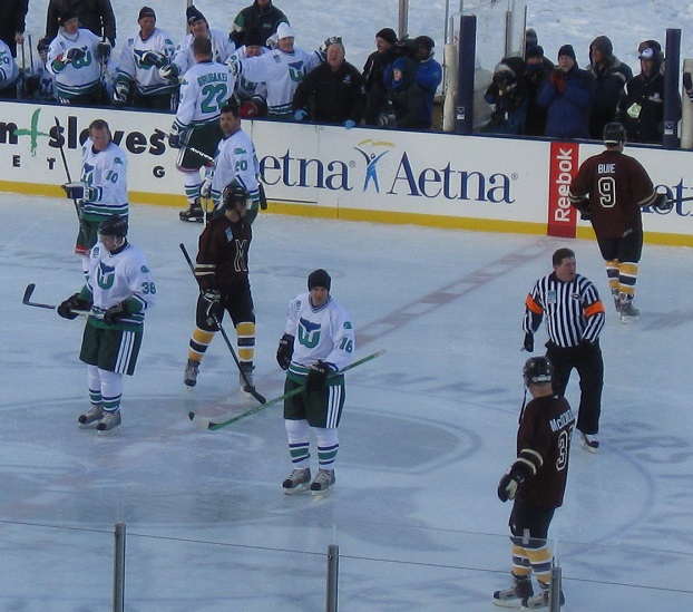 The alumni game was divided into two 25-minute halves with a running clock. Given the weather, that wasn't terrible, but it did mean that potentially less than 20 minutes of hockey would be played in either half. The first half turned out to be the competitive half, leading to a 3-2 Whalers edge that I'll label a win. Given the age of some of these players, it's no surprise that the second half turned out to be more laid back and less serious.