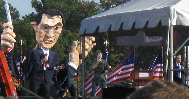 Sensing he was losing the debate, Colbert brough out the Fear Puppet, and proclaimed that Jon was dead because the massive representation of fear killed him. This is why I say "most bizarre" dialogue. Not sure what the puppet's holding, but it didn't inspire fear.