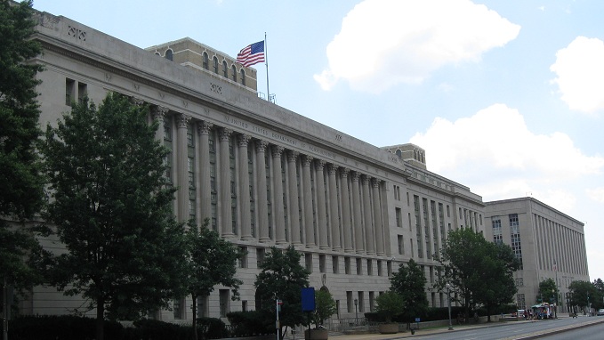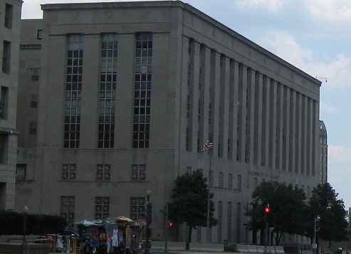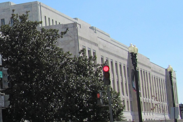 Looking north across the Mall at the Dept. of Commerce and International Trade Center, then two sides of the Bureau of Engraving and Printing.