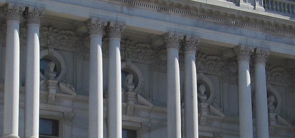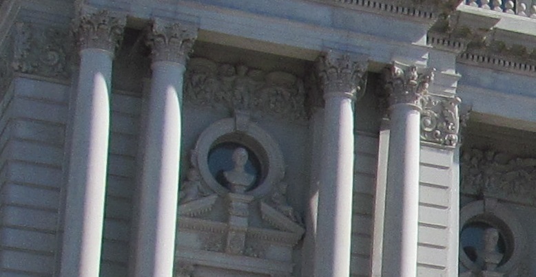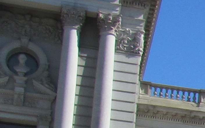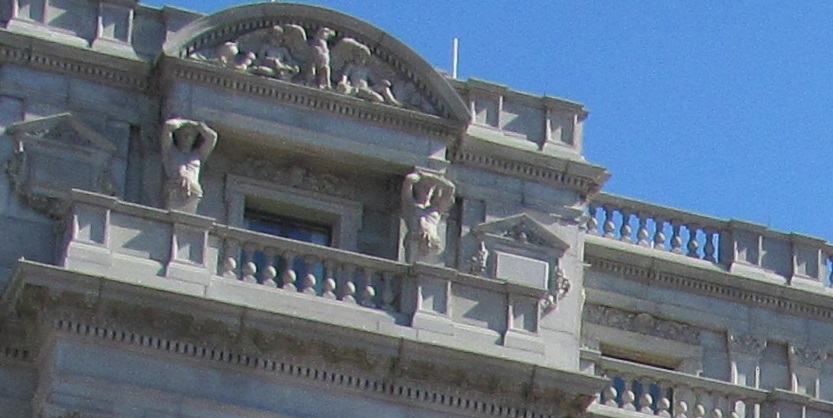 From top to bottom, many of the architectural details of the TJ Building. It appears that the upper windows have a row of "great men" (not presidents), but I can't identify them even at this resolution.