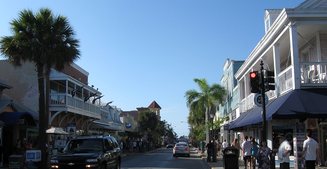 Another 1891 building at the corner of Front and Duval Streets, the former Florida First National Bank, then looking southeast down Duval from Wall St. (the waterfront) with the bank visible in the back left. This is all within a block of Mallory Square, the heart of downtown.