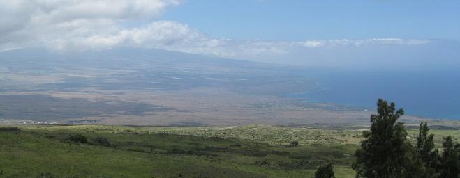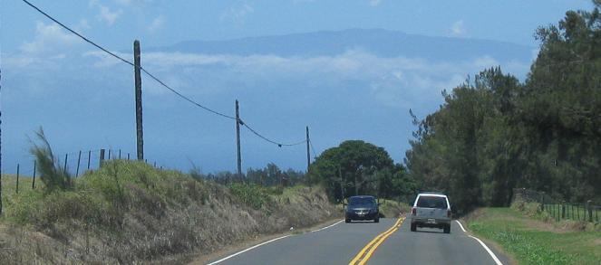Northbound on HI Route 250, Kohala Mountain Road, apparently voted the most scenic drive in the world by Travel Magazine. I heard that from Hawai`i tourism, but couldn't verify it on this side of the Pacific. What you see above the clouds in the second photo is Haleakala, 20 miles distant on Maui. That's right, 20 miles away it still dominates the entire sky - because it's a volcanic dome, the slopes are much gentler than on most (tectonically formed) mountains, so it spreads for miles and miles from its 10,023-foot summit. The cloud line is around a mile high, and I'll let you do your own math on how many miles of Haleakala you see here.