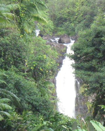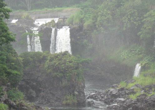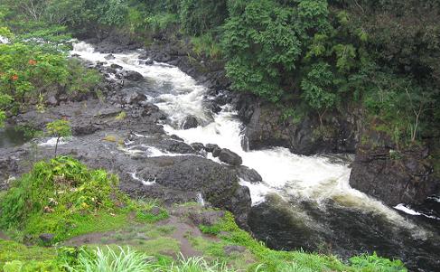 The Boiling Pots in the first photo are just downstream of the immaculately named Pe`epe`e Falls, saved only by the mild `okina. There is one street sign missing it, on the Big Islands Roads page linked at bottom. Pe`epe`e is up the Wailuku River from Rainbow.